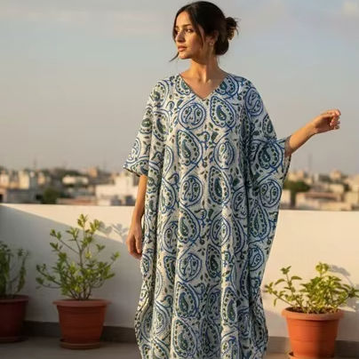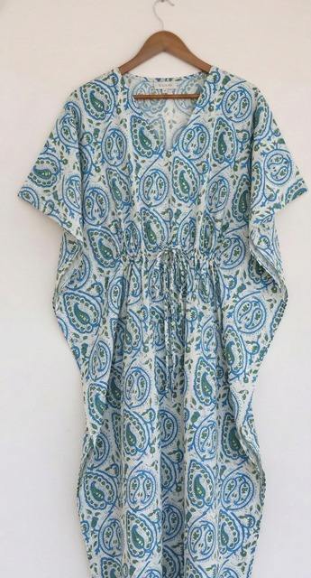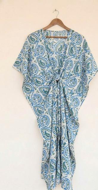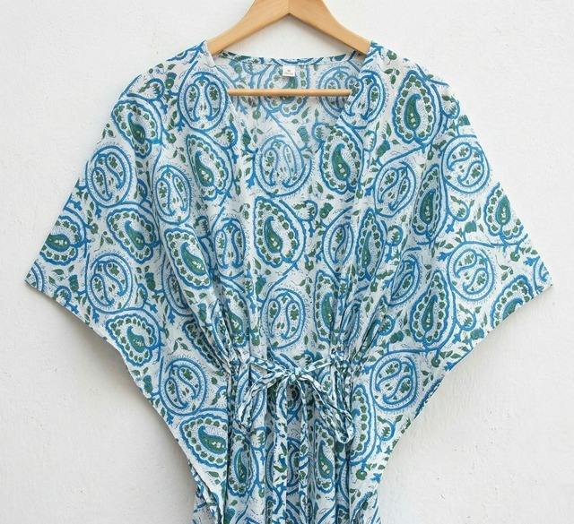 Robe kaftan d'été bohème pour femmes en coton imprimé à la main, respectueuse de l'environnement, avec des motifs tie-dye