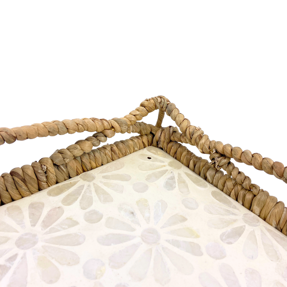 Plateau de service rectangulaire élégant fait main en MDF avec incrustation de capiz blanc motif de marguerite poignées de jacinthe d'eau plateau décoratif
