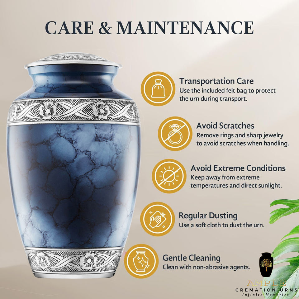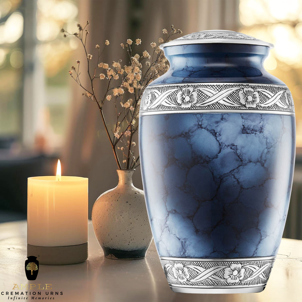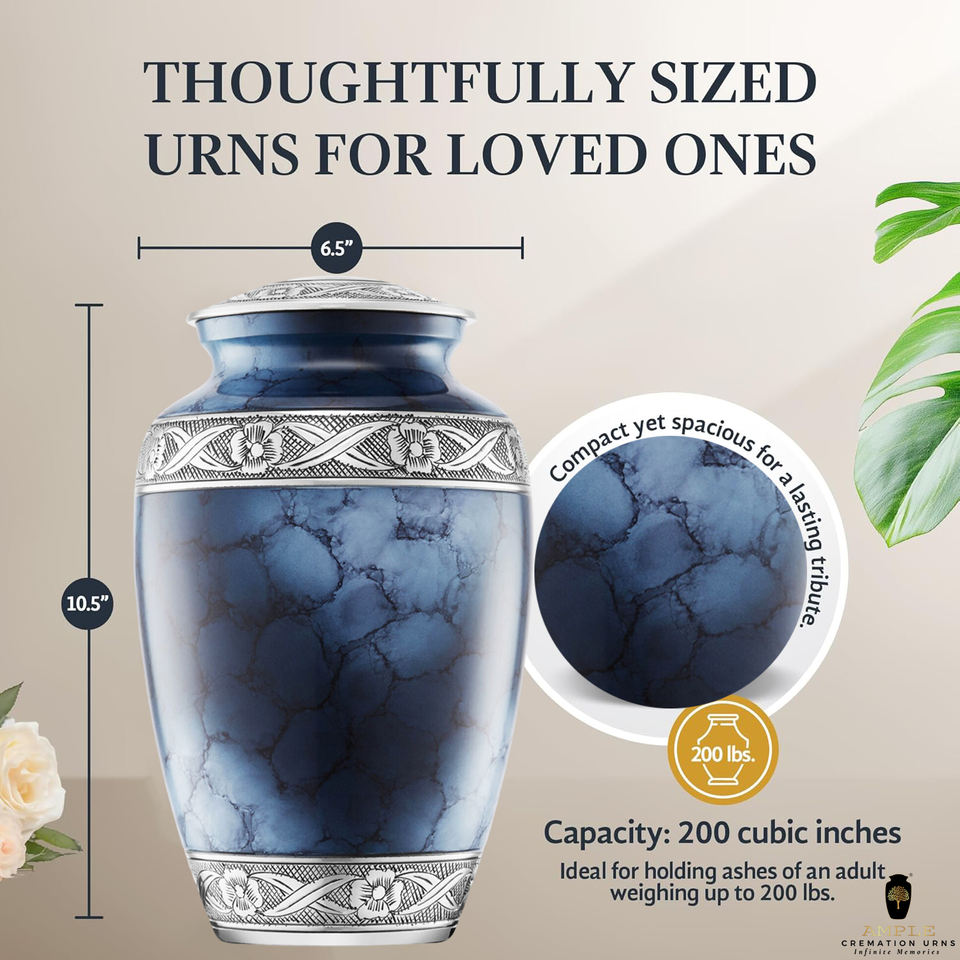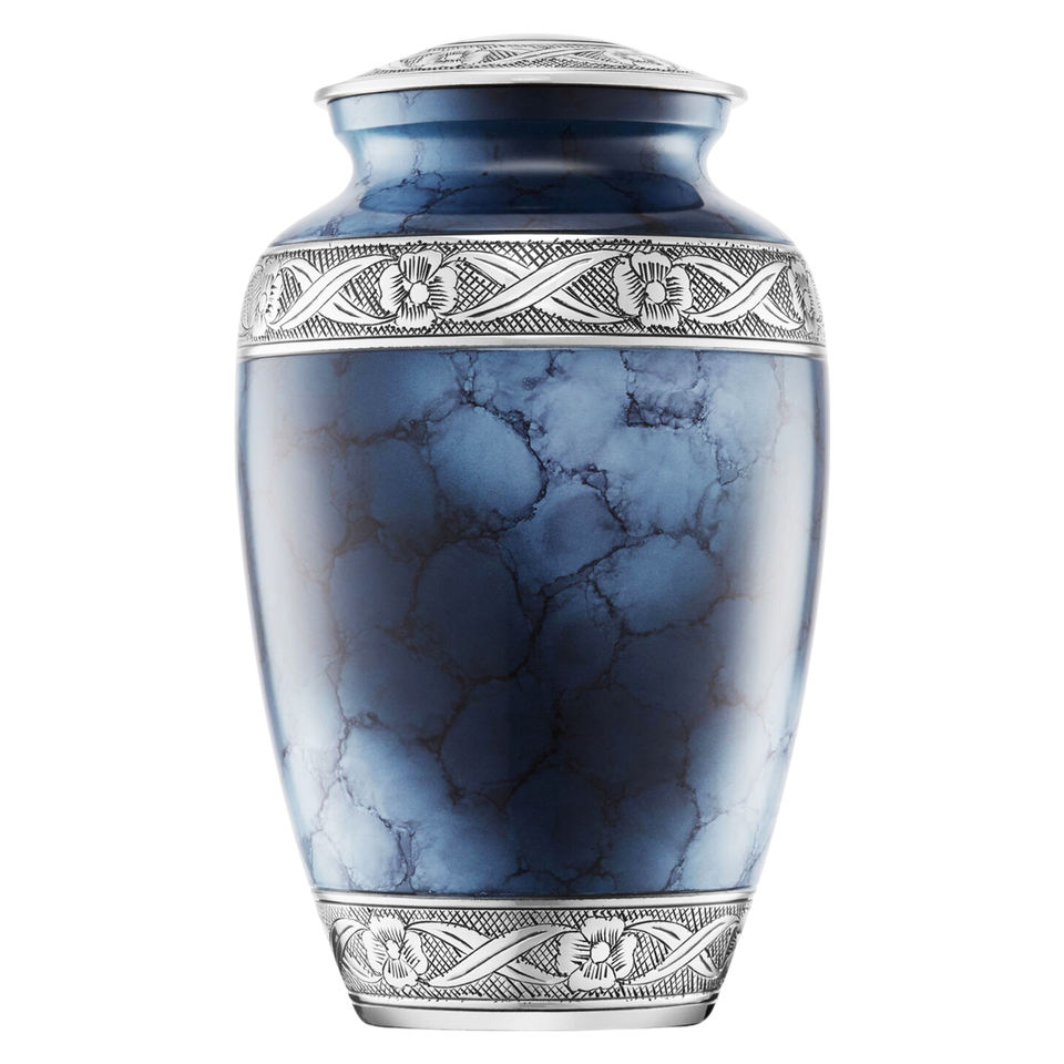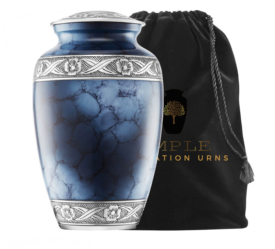 Urnes funéraires pour adultes de style européen faites à la main, couleur bleu et argent, 10 pouces, sac en velours, écologiques, durables, design personnalisable