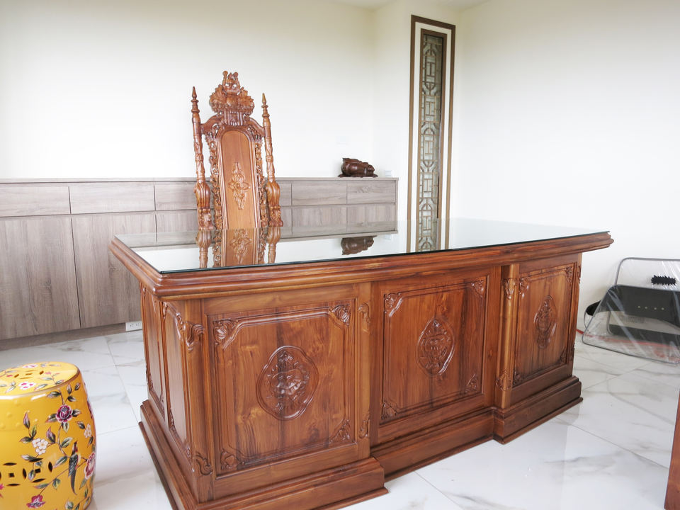 Bureau de travail modulaire commercial en bois de teck massif sculpté de style européen antique fait à la main, longueur de 6,5 pieds pour salle d'étude et bureau