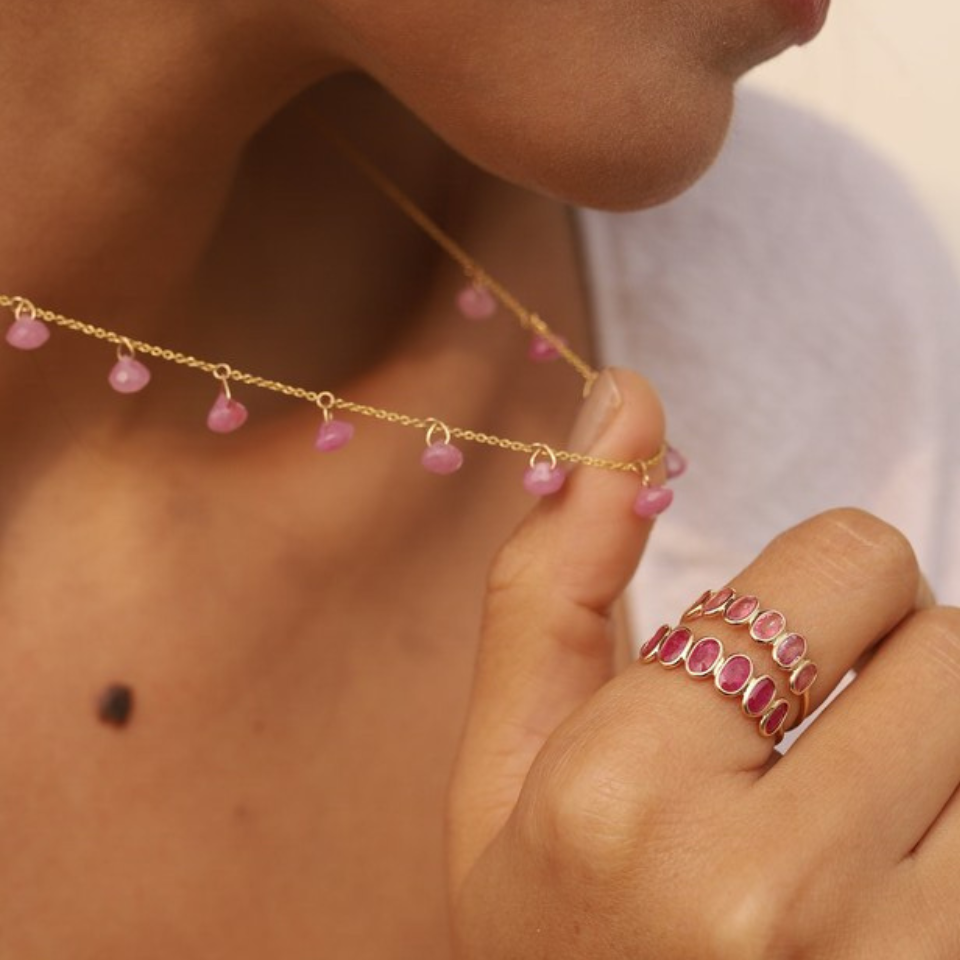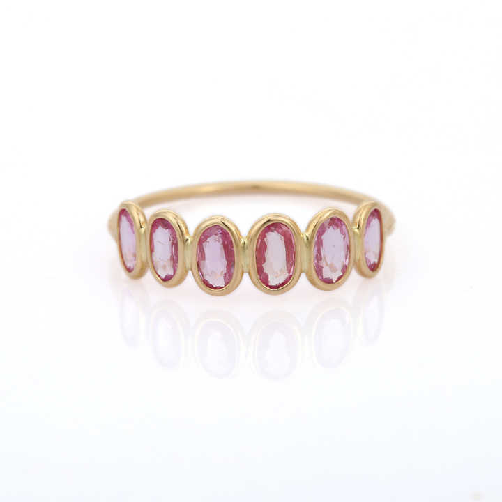 Bijoux fins faits à la main saphir rose ovale naturel demi-éternité bagues en or jaune massif 18 carats bague empilable pour les femmes