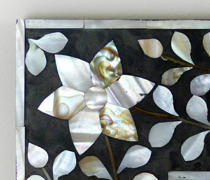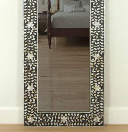 Miroir mural artisanal en incrustation d'os floral avec résine noire et copeaux d'os multicolores, accent décoratif pour la décoration intérieure
