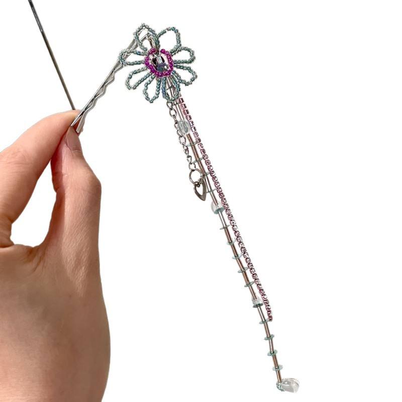 Épingle à cheveux artisanale en perles florales avec pendentif cœur en cristal, accessoire capillaire en alliage mignon pour femme, usage quotidien