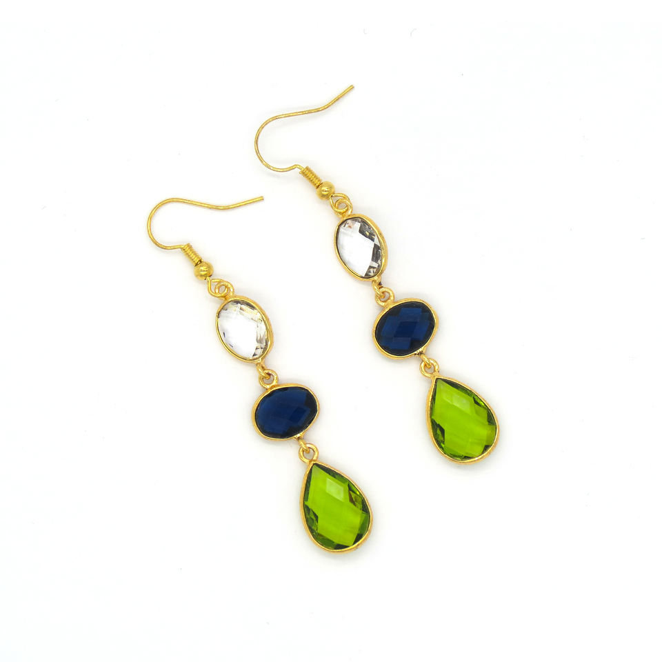 Boucles d'oreilles pendantes bohèmes faites à la main avec fleurs et pierres précieuses multiples serties en clos | Quartz cristallin, Iolite, Péridot | Laiton plaqué or 18 carats