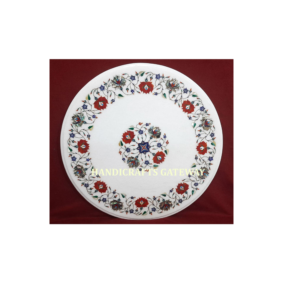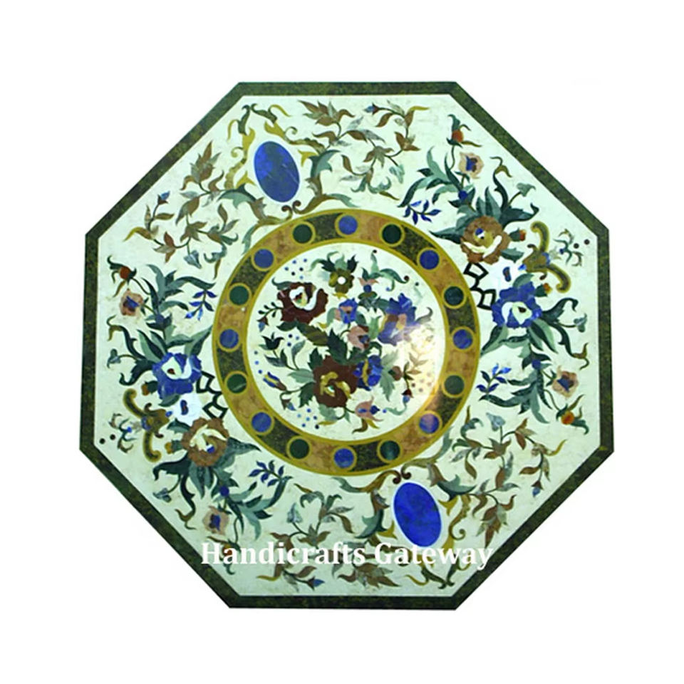 Plateau de table octogonal en marbre blanc naturel avec incrustations de fleurs faites à la main, surface lisse et brillante, utilisé comme table basse dans un hôtel