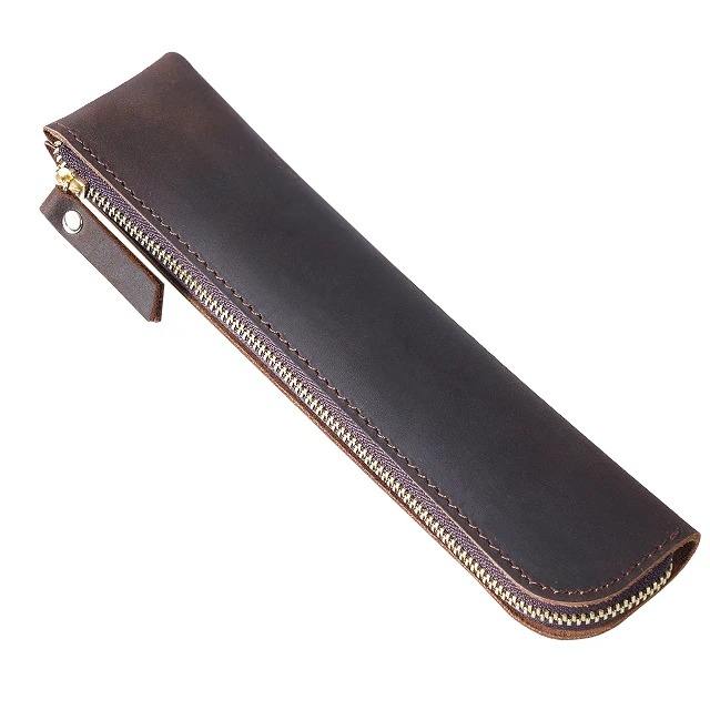 Handmade Genuine Leather Eco-Friendly Large Capacity Vintage Retro Style Zipper Pencil Bag Pen Case for School and Office