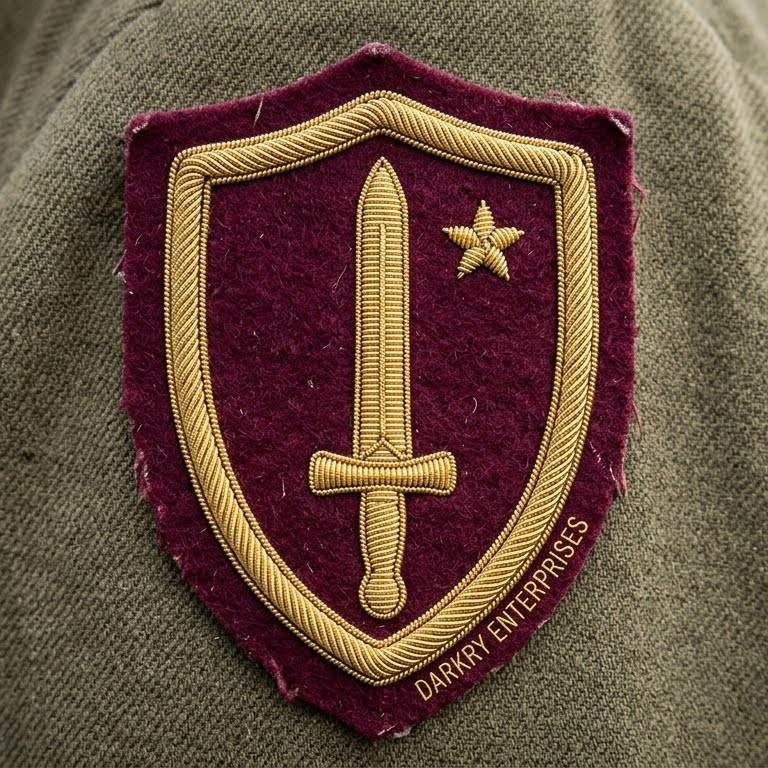 Écusson brodé à la main en fil d'or, motif bouclier croisé, insignes de couronne en feutre vert olive, service sur mesure