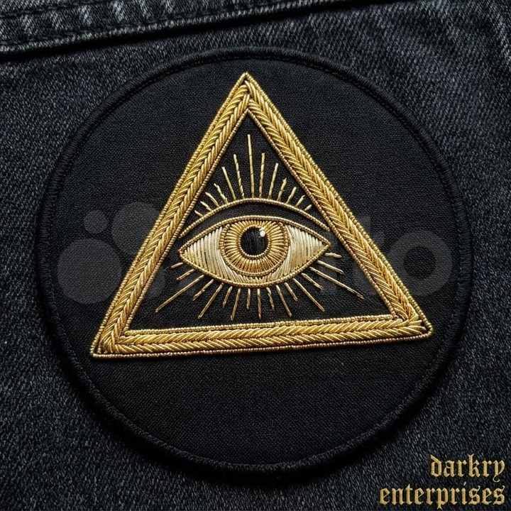 Écusson brodé fait main en fil d'or, motif Triangle de l'Œil Tout-Voyant maçonnique, badge de régalia personnalisé, rond noir