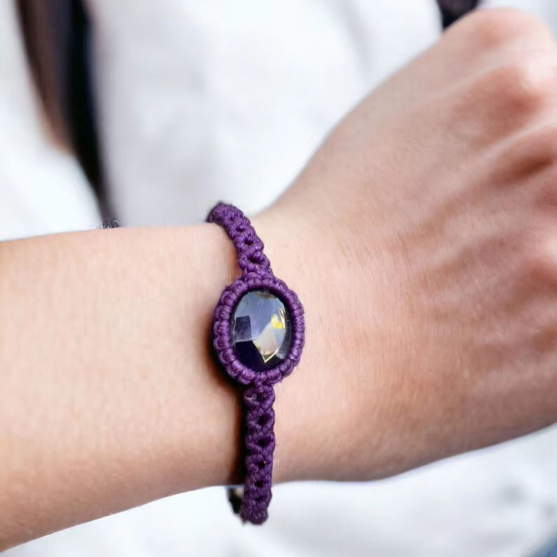 Bracelet ajustable fait main en macramé violet plaqué or avec pierres précieuses facettées, cordon ciré, style bohème vintage, cadeau minimaliste pour fiançailles