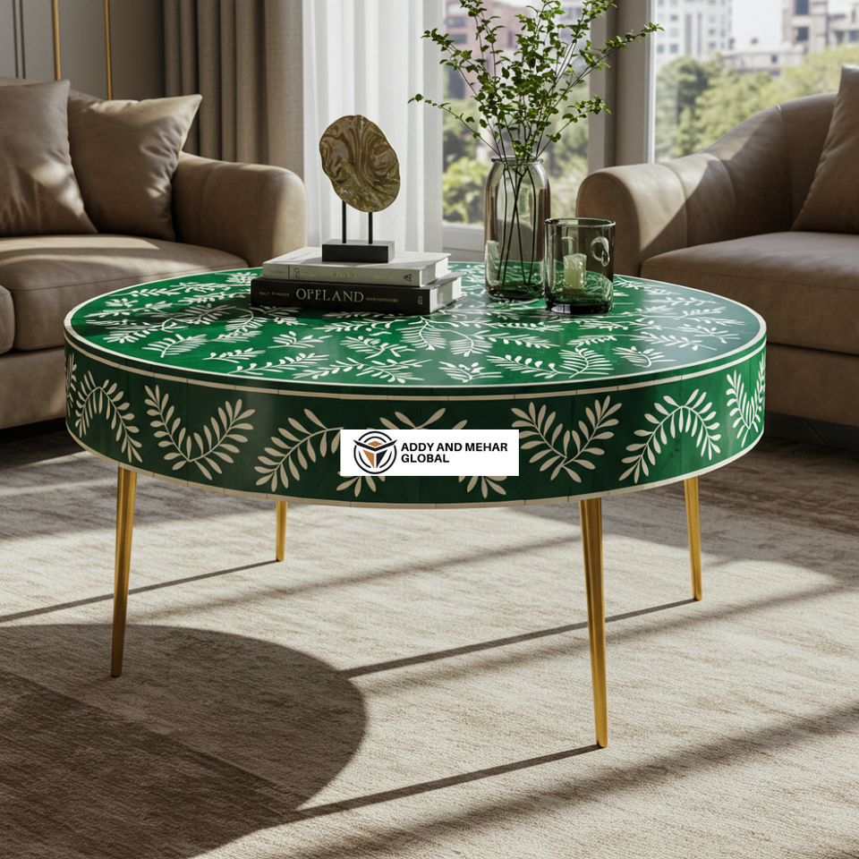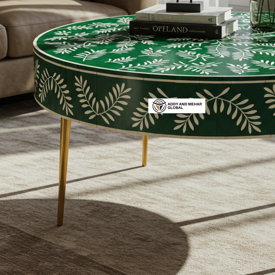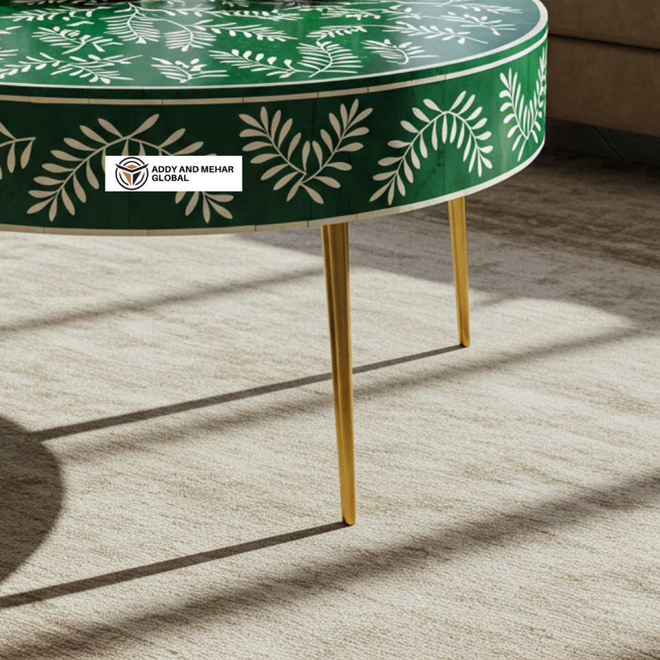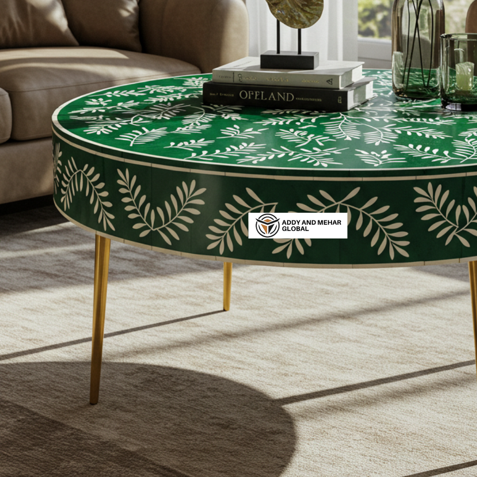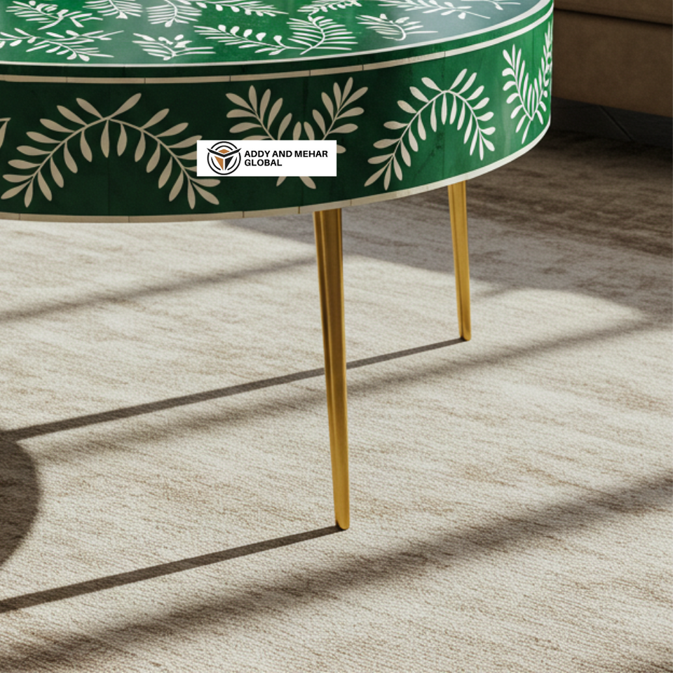 Table basse ronde en os vert incrusté faite à la main, motif floral, avec base en métal doré