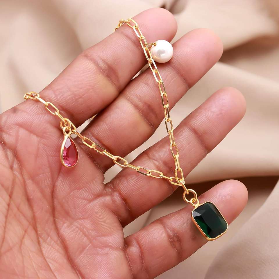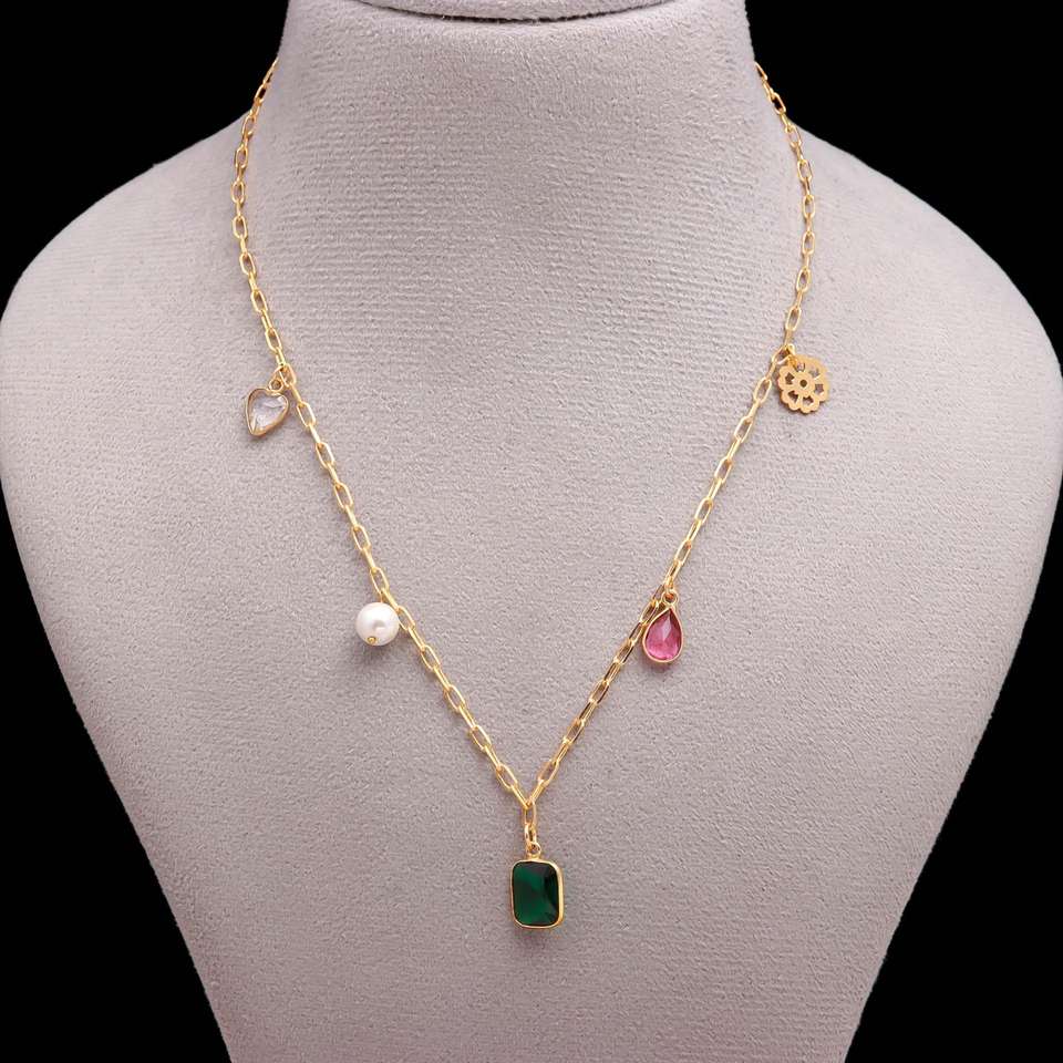 Collier artisanal en quartz vert avec breloque en pierres précieuses multicolores, plaqué or 18 carats sur argent sterling 925