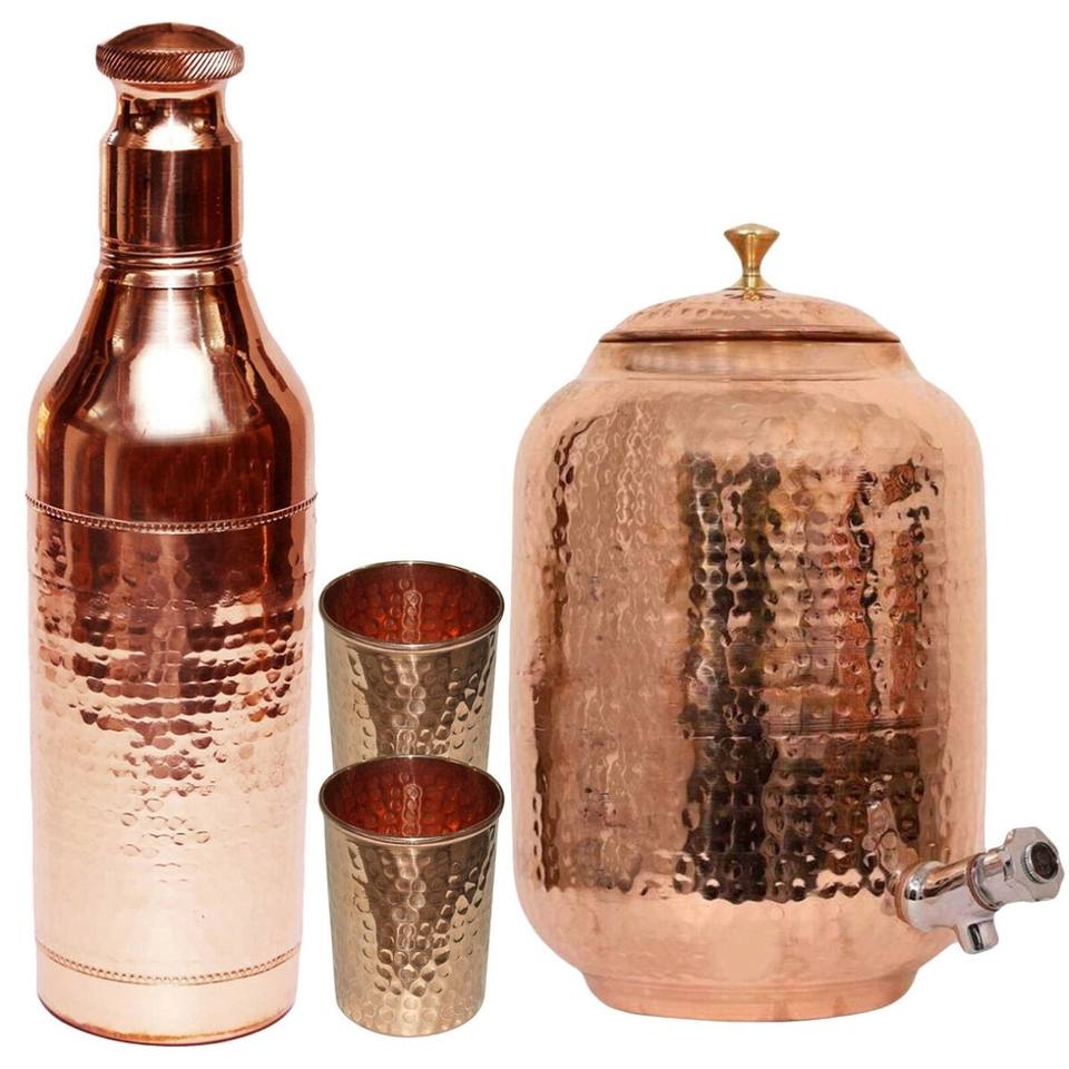 Distributeur d'eau en cuivre martelé fait main avec robinet et couvercle | Ensemble de 5 pièces en cuivre pour boissons, pour la maison et l'hôtellerie, approvisionnement en gros 8L/10L