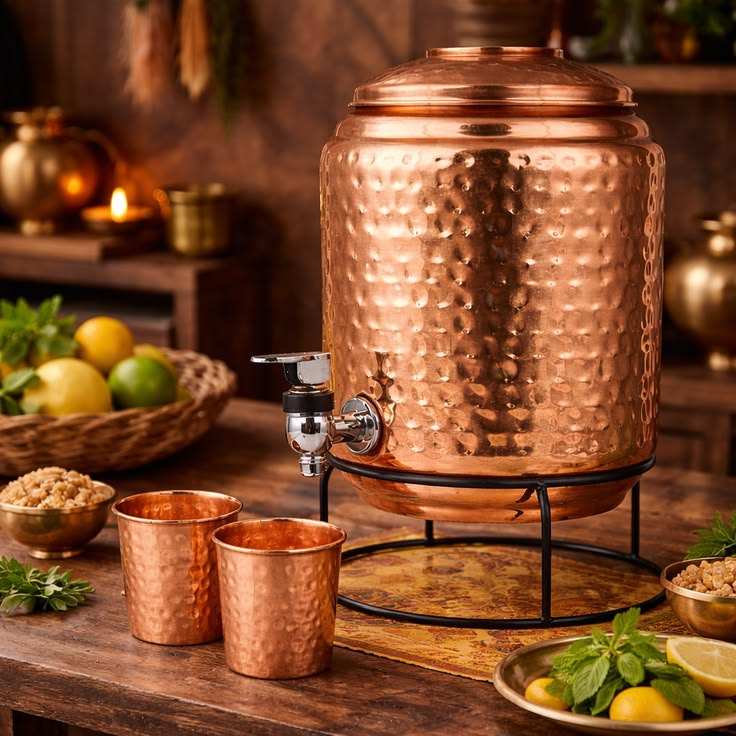 Distributeur d'eau en cuivre martelé fait main avec robinet, pot à boisson ayurvédique pour la maison, la cuisine et la table à manger