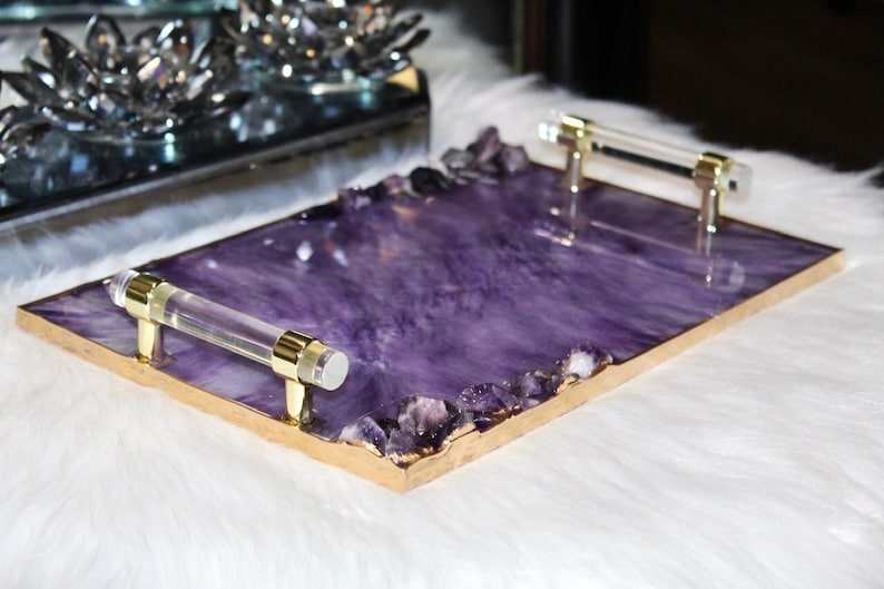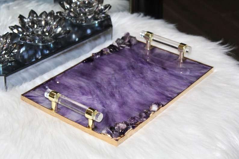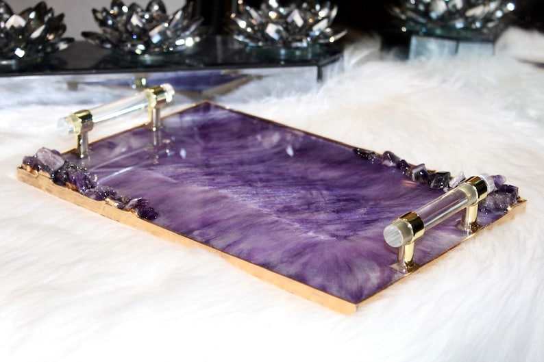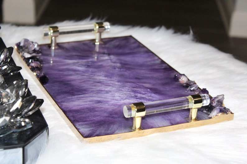 Plateau de service décoratif en résine d'améthyste, fait main, peint à la main, personnalisable, avec poignées dorées transparentes comme du cristal