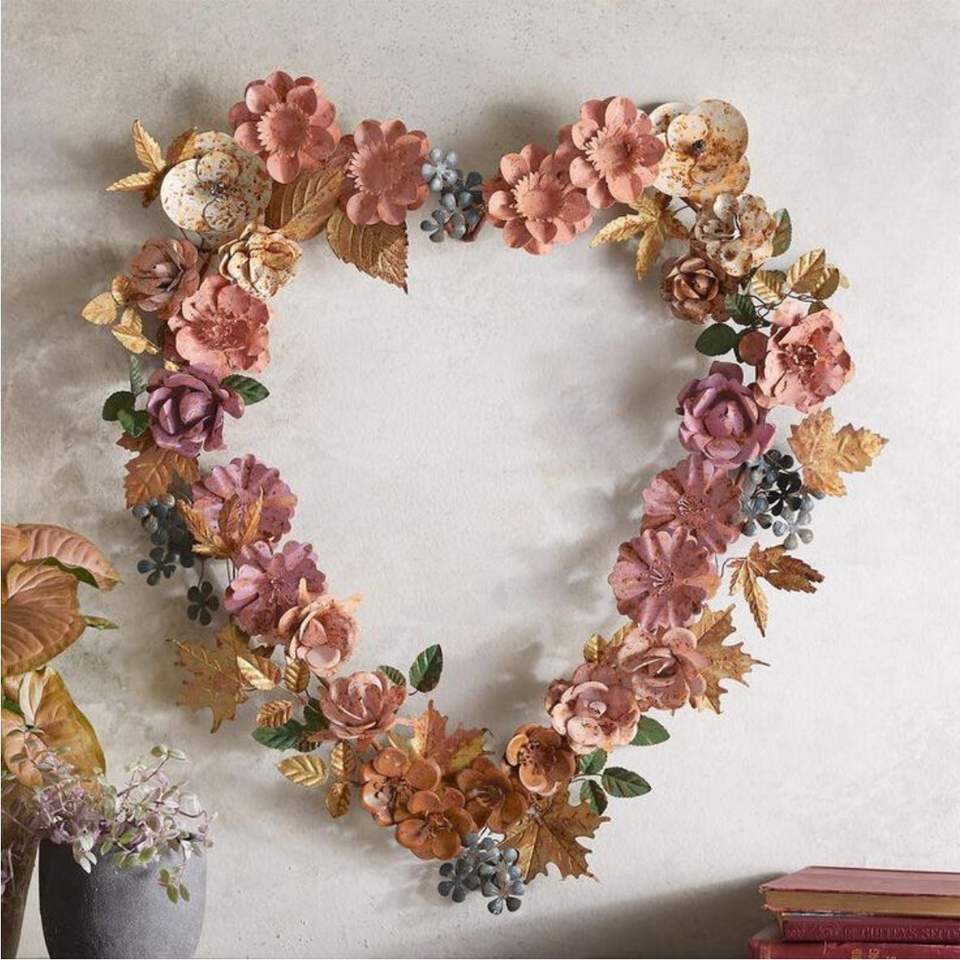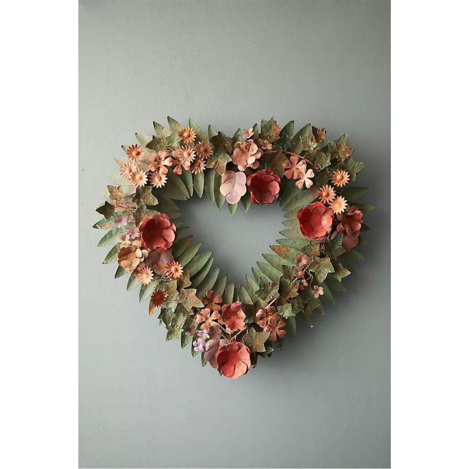 Couronne murale en métal en forme de cœur, faite à la main, en fer rouillé, motif floral, art de jardin, sculpture florale suspendue pour extérieur, décoration murale pour la maison et les mariages