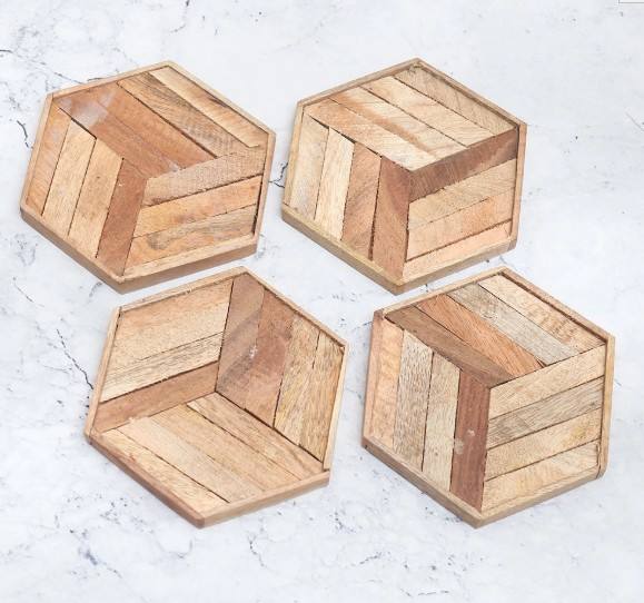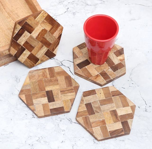 Handmade Hexagonal Shape Wooden Coasters Set for Home Decor Natural Wood Drink Coasters for Stylish Table Top Decorative Use