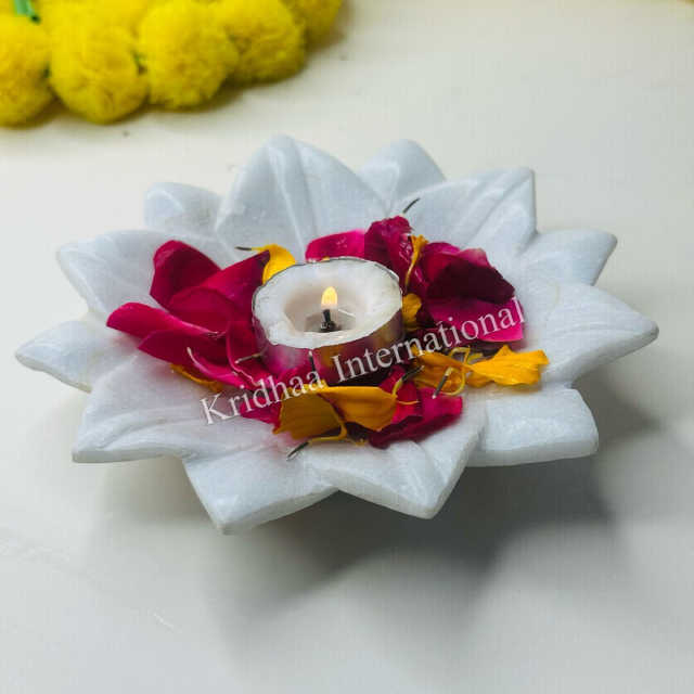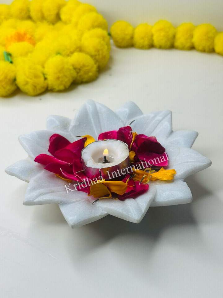 Fait à la main de haute qualité marbre blanc Urli élégant fleur coupe pierre artisanat pour la décoration de Temple pur naturel élégant pièce polie