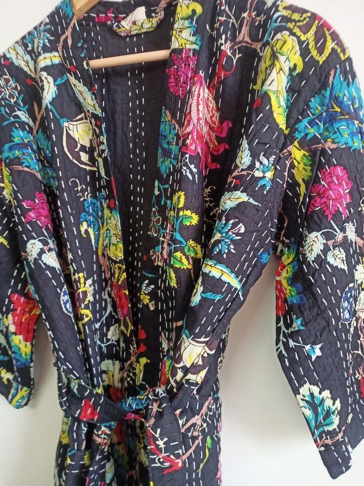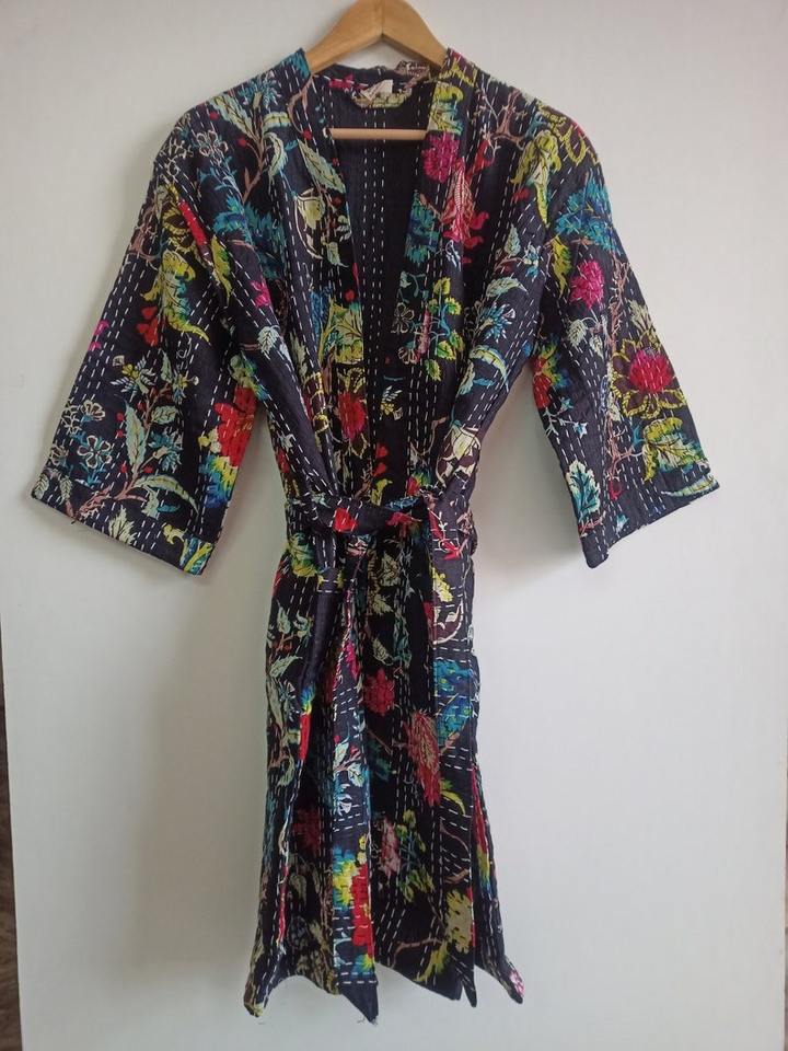 Fait à la main indien Kantha point Robe hiver Floral veste robe de nuit avec lettre Unique motif Floral Kantha Robe