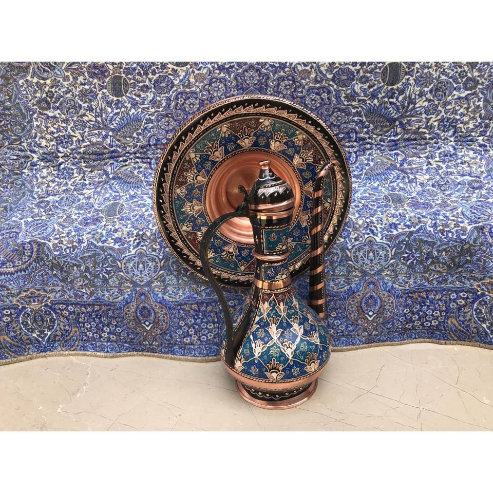 Pichet turc incrusté à la main avec assiette, décor de cuisine fait à la main, aiguière sculptée, décor unique en cuivre, pichet sculpté décoratif