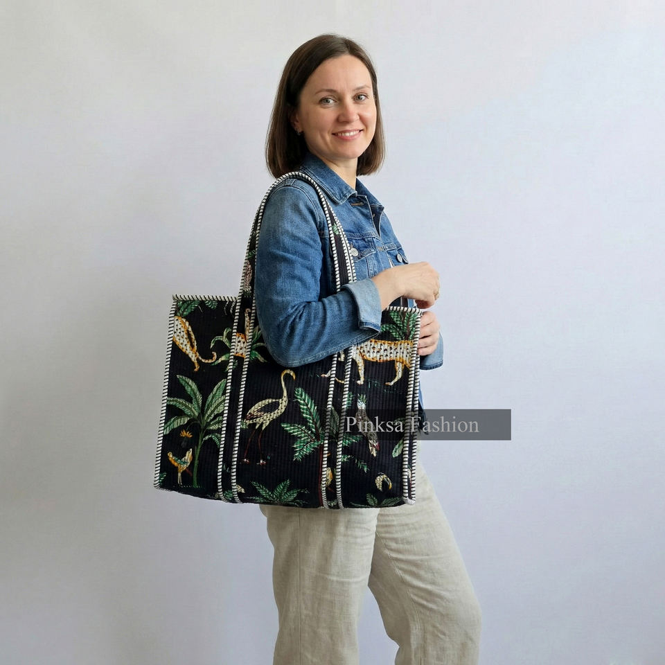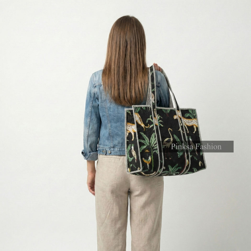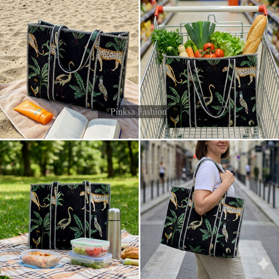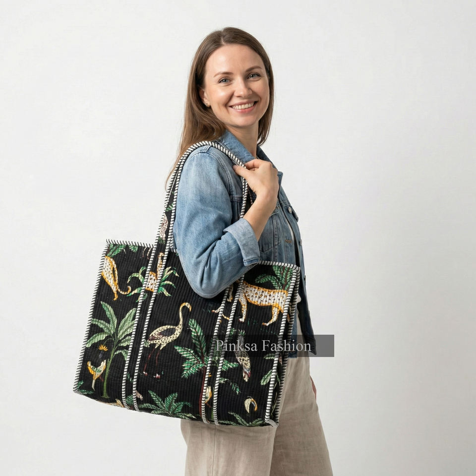 Sac fourre-tout matelassé en coton léger fait main de Jaipur, imprimé animaux et plantes, grande capacité, écologique, réutilisable, pour femme