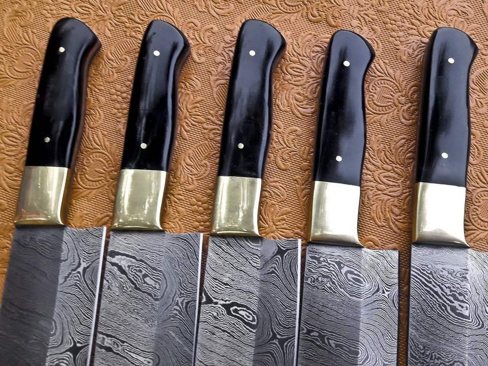 Ensemble de couteaux de chef en acier Damas de style japonais, fabriqué à la main, manche en corne de buffle, emballage personnalisé écologique, couteau de cuisine en cuir