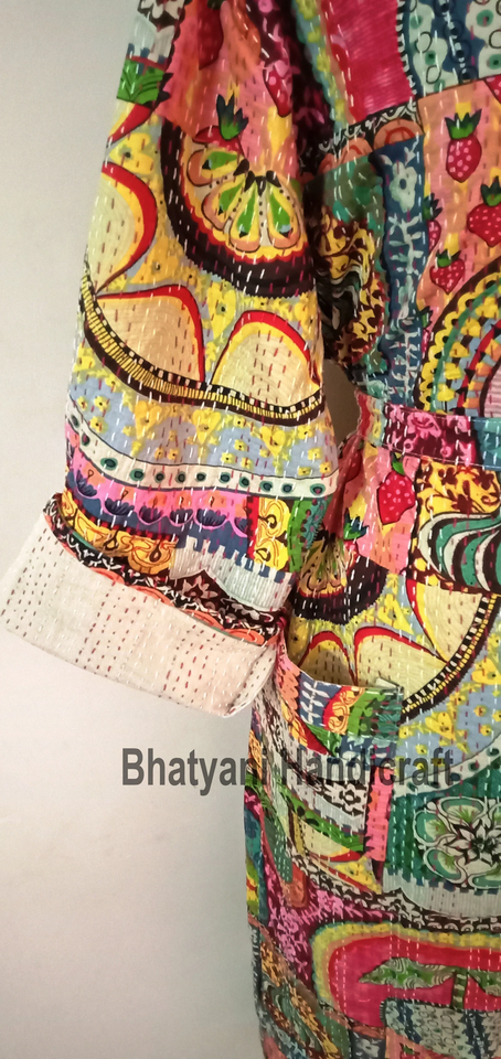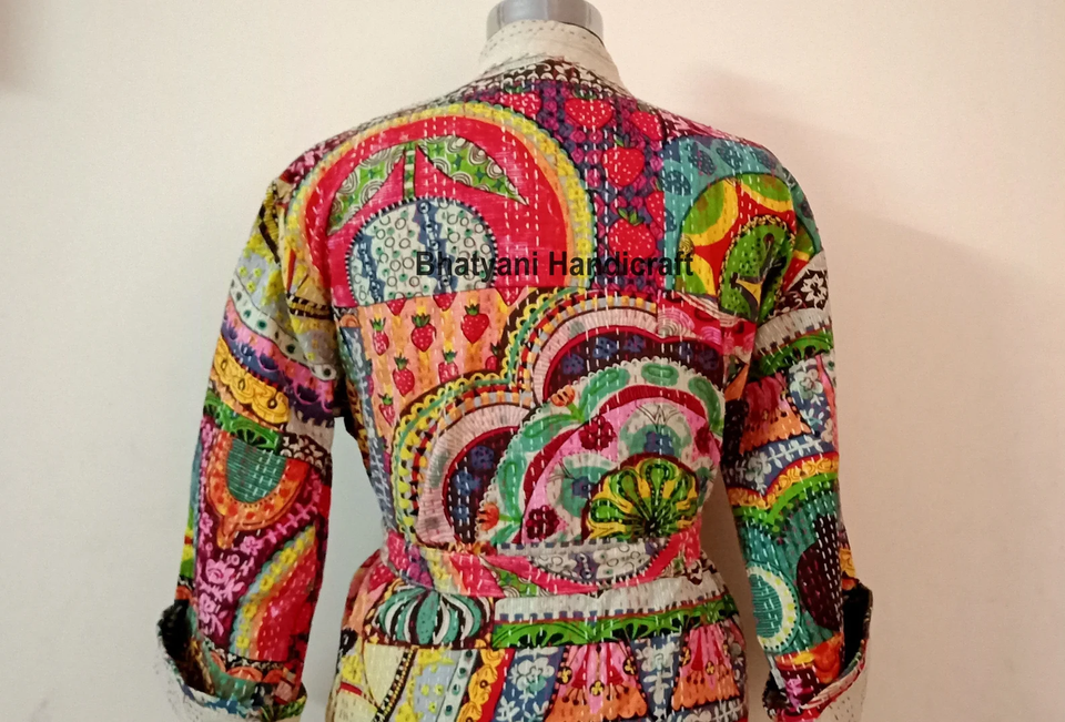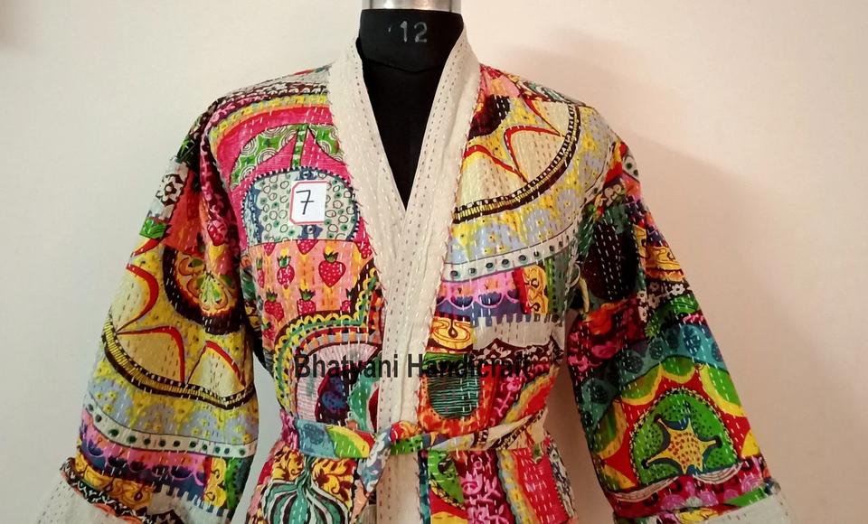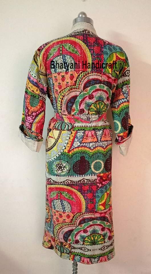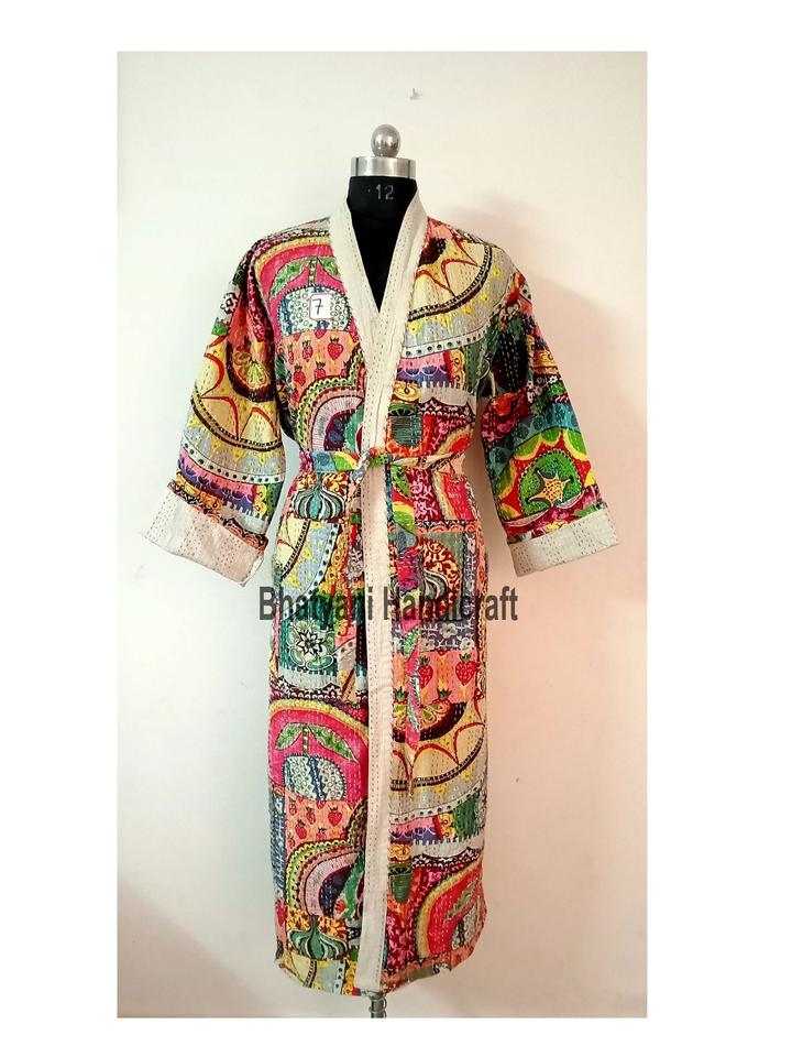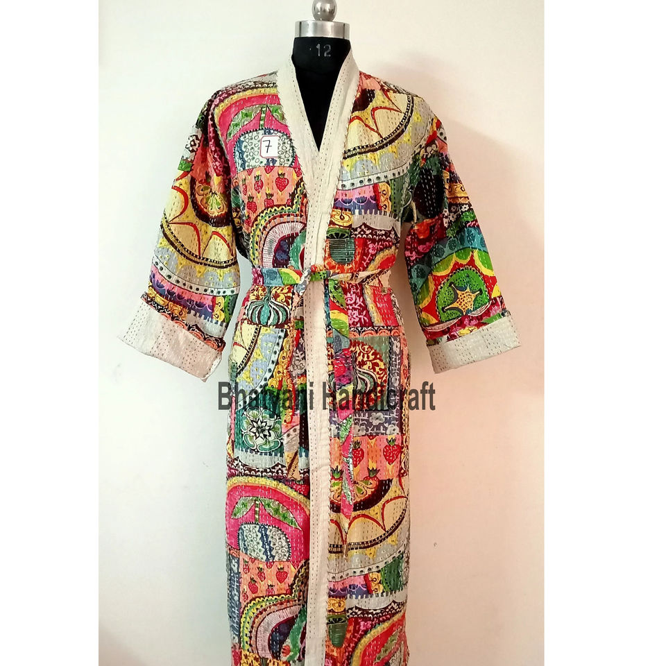 Veste Kantha faite à la main pour femmes longue robe matelassée en coton avec coquille en cuir XL vêtements de plage Kimono respirant couvre-lit de plage