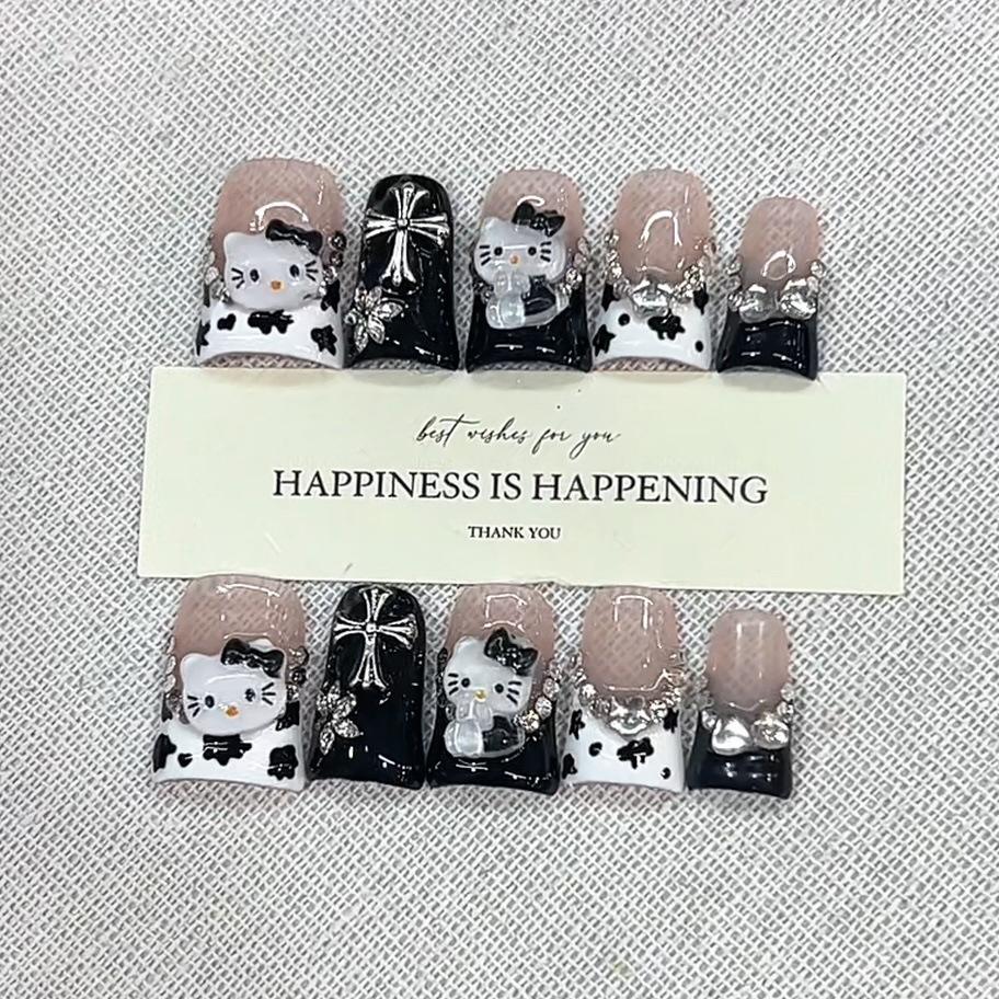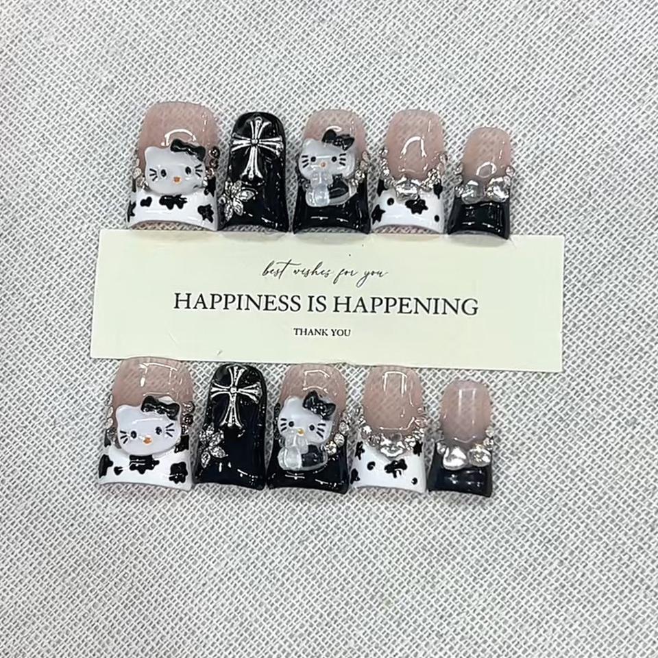 Faux ongles à presser faits main motif chat et canard, 10 pièces, réutilisables et en acrylique, avec colle