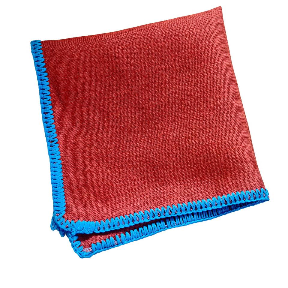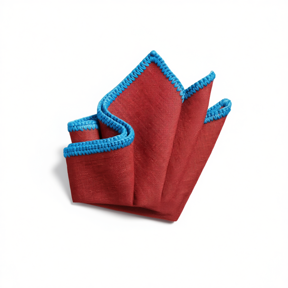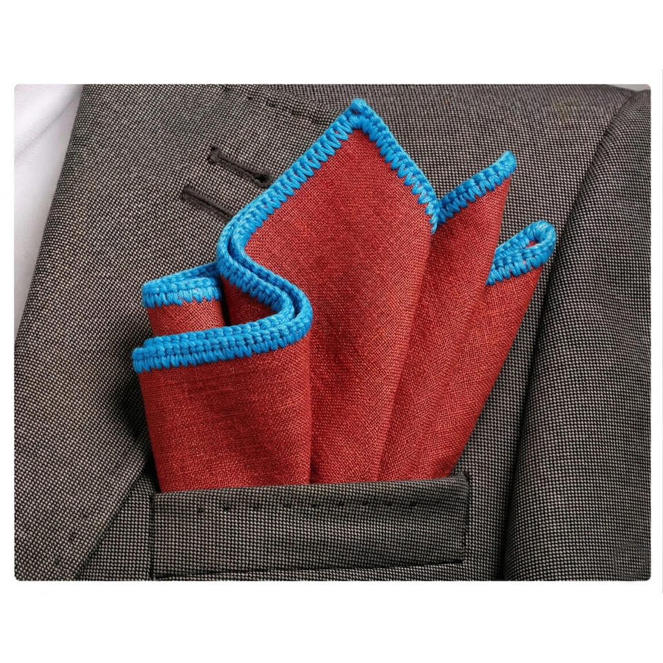Pochette de costume en lin faite main à bordure tricotée, motif carreaux rouges et bleus, accessoire de dîner pour blazer homme