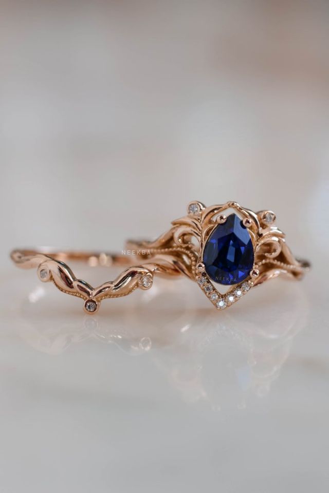 Ensemble de bagues de mariée en forme de feuille faites à la main-Bague de fiançailles en saphir bleu en forme de poire en or rose massif 14K et bande de moissanite incurvée en V