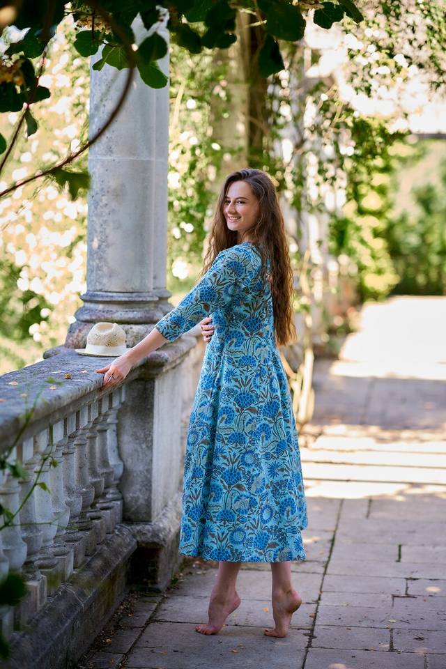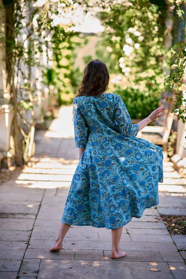 Handmade Leah Dress Bohemian Calf Length Hand Block Printed Floral Casual Occasional Blue Brown