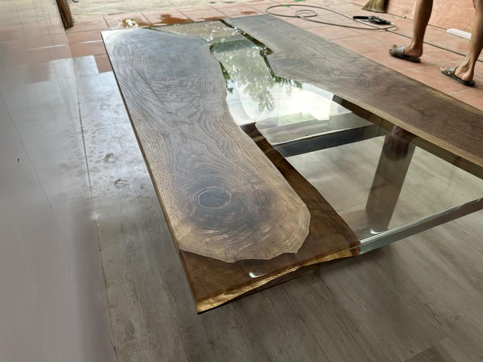 Table en bois massif à bord vif fait main avec verre transparent, style moderne, meubles en bois naturel, vente en gros pour la maison et le bureau