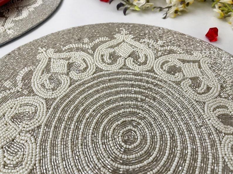 Napperon de table artisanal de luxe, écologique, anti-taches, à petites perles dorées, forme radiale découpée, pour mariage