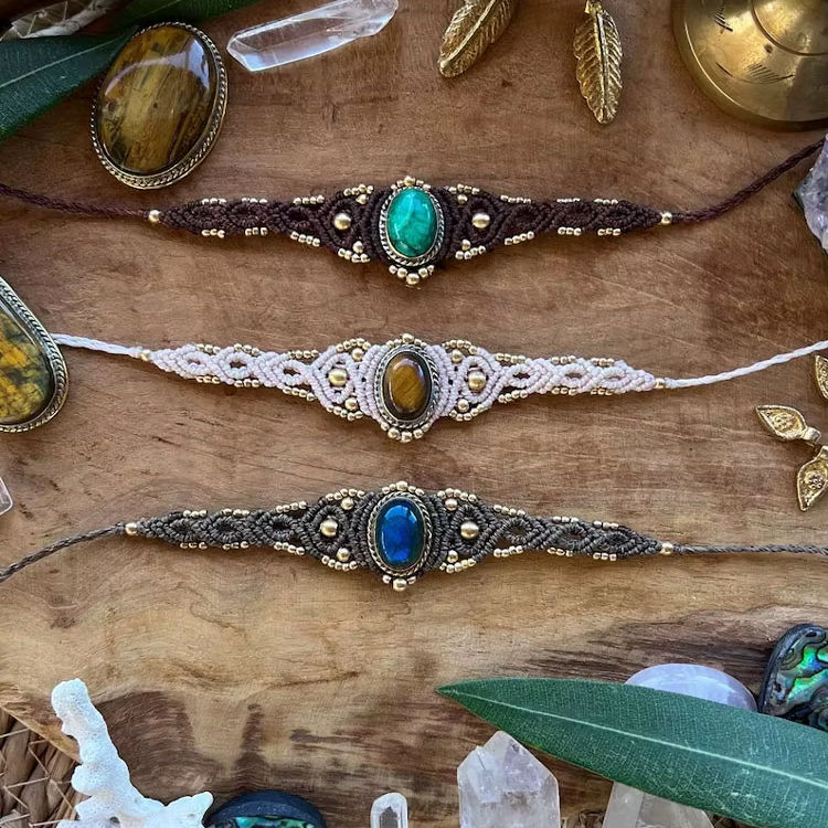 Ensemble de bracelets en macramé faits à la main avec pierres précieuses, style bohème, cordons ajustables, bijoux artisanaux, plaqué or, prix de gros