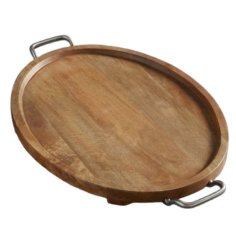Plateau de service rond en bois de manguier fait main avec poignées en acier inoxydable, plateau décoratif en bois pour table basse, ottoman, maison et cuisine