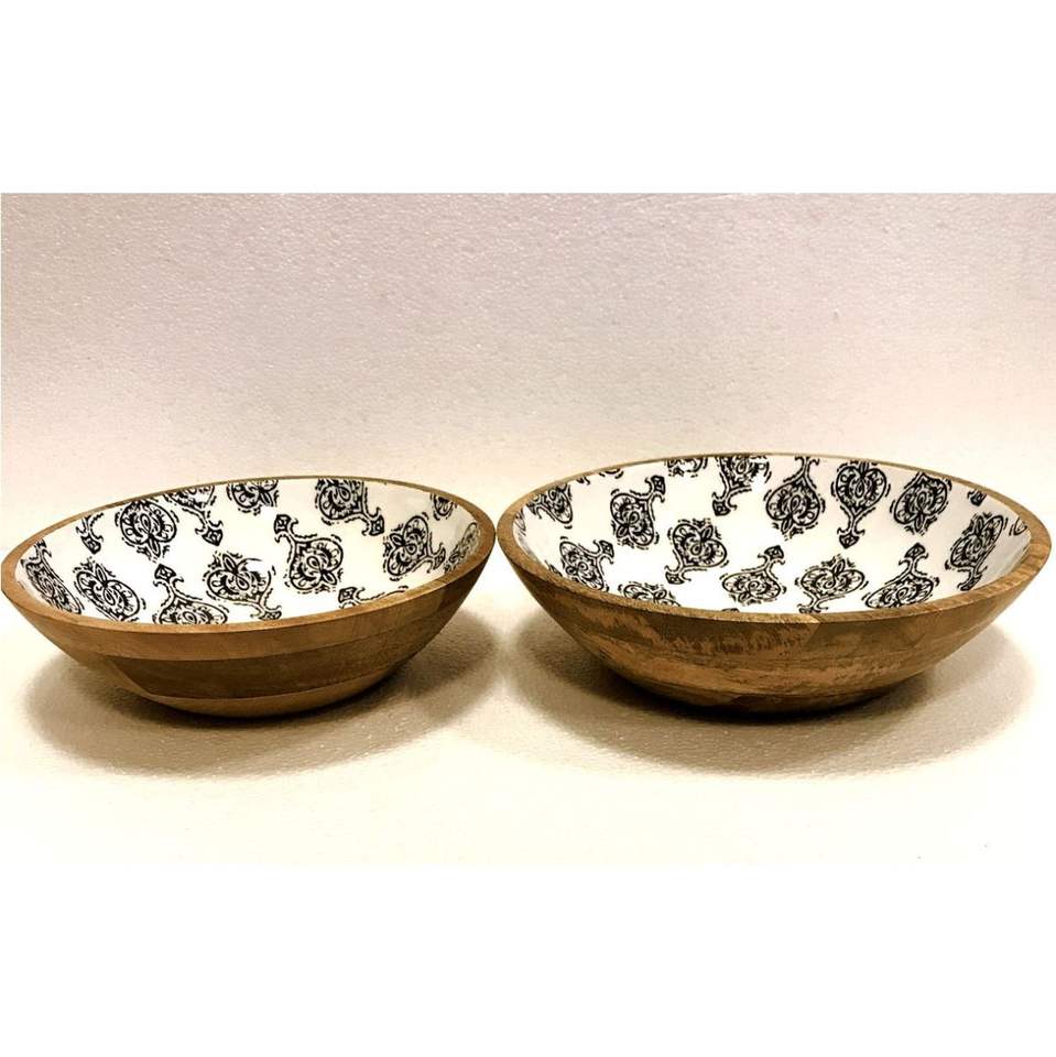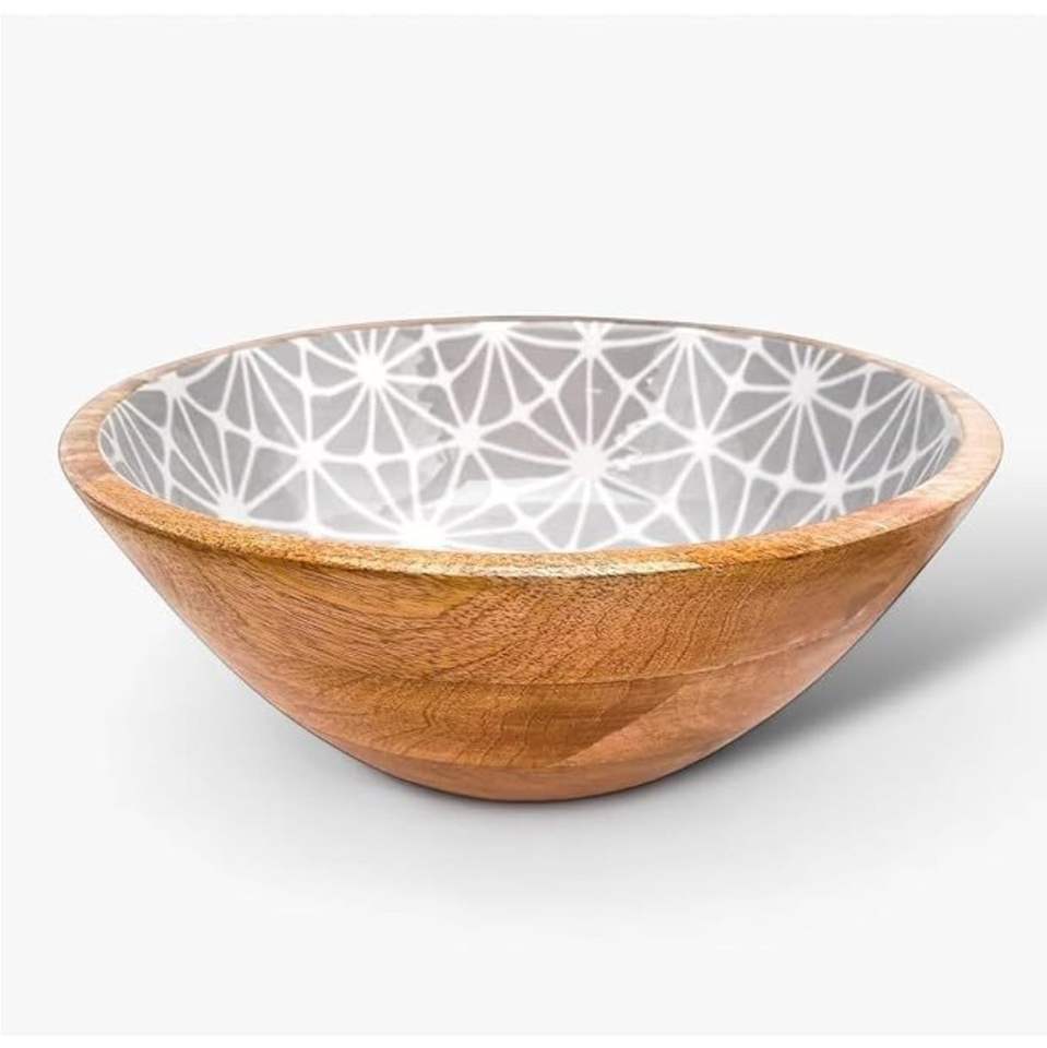 Ensemble de saladiers en bois de manguier faits à la main, imprimés en émail bleu floral, grand bol décoratif en bois pour fruits, pour la décoration de la maison