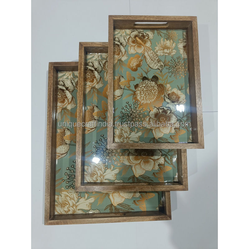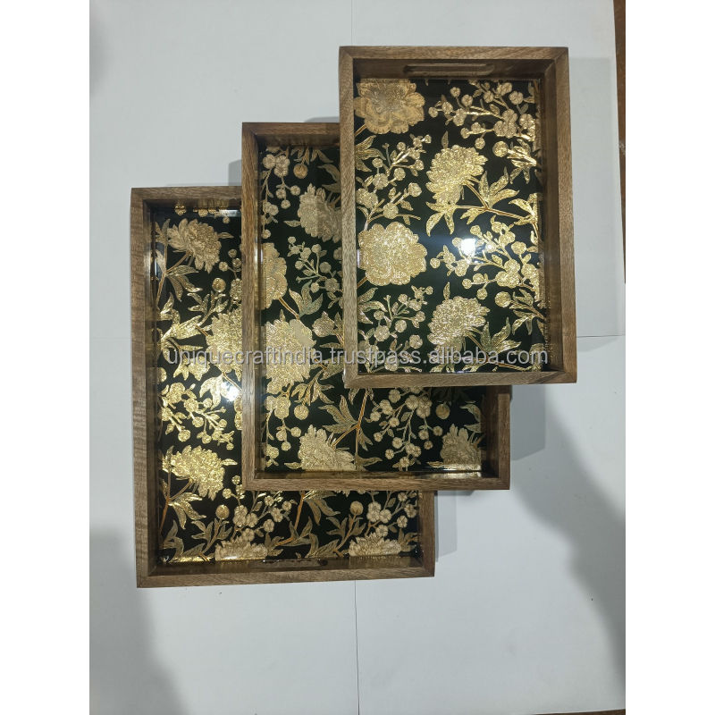 Ensemble de plateaux de service en bois de manguier faits à la main, art émaillé botanique doré, plateaux décoratifs en bois avec poignées, décoration de luxe pour la maison