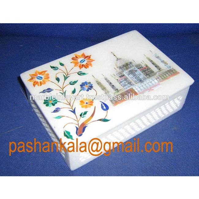 Boîte à bijoux en marbre incrusté faite à la main avec un motif du Taj Mahal