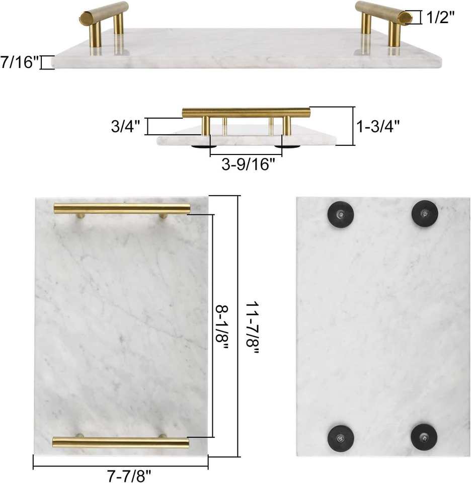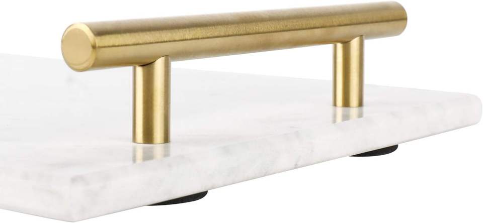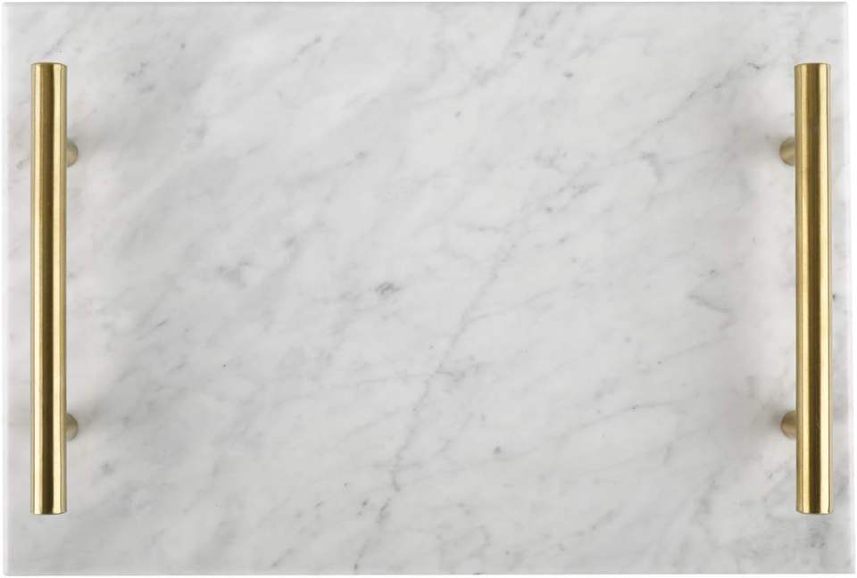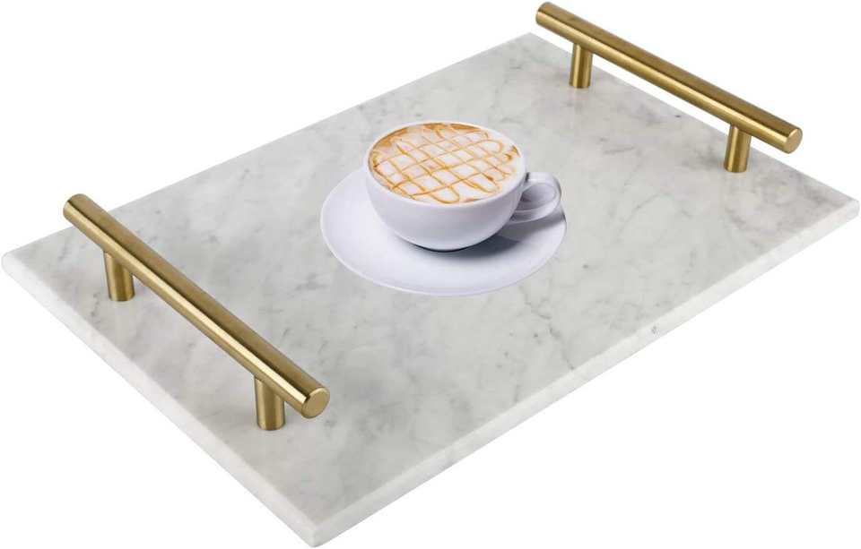Plateau décoratif en marbre fait main avec poignées en métal doré, élégant organisateur de coiffeuse