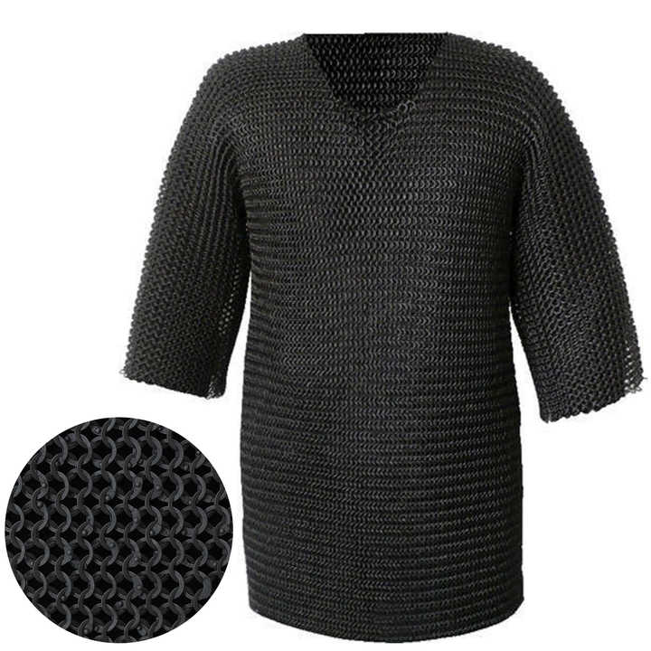 Cotte de mailles médiévale faite à la main Hauberk manches complètes armure en métal avec anneau de rondelle riveté plat en acier doux finition noire Haubergeon