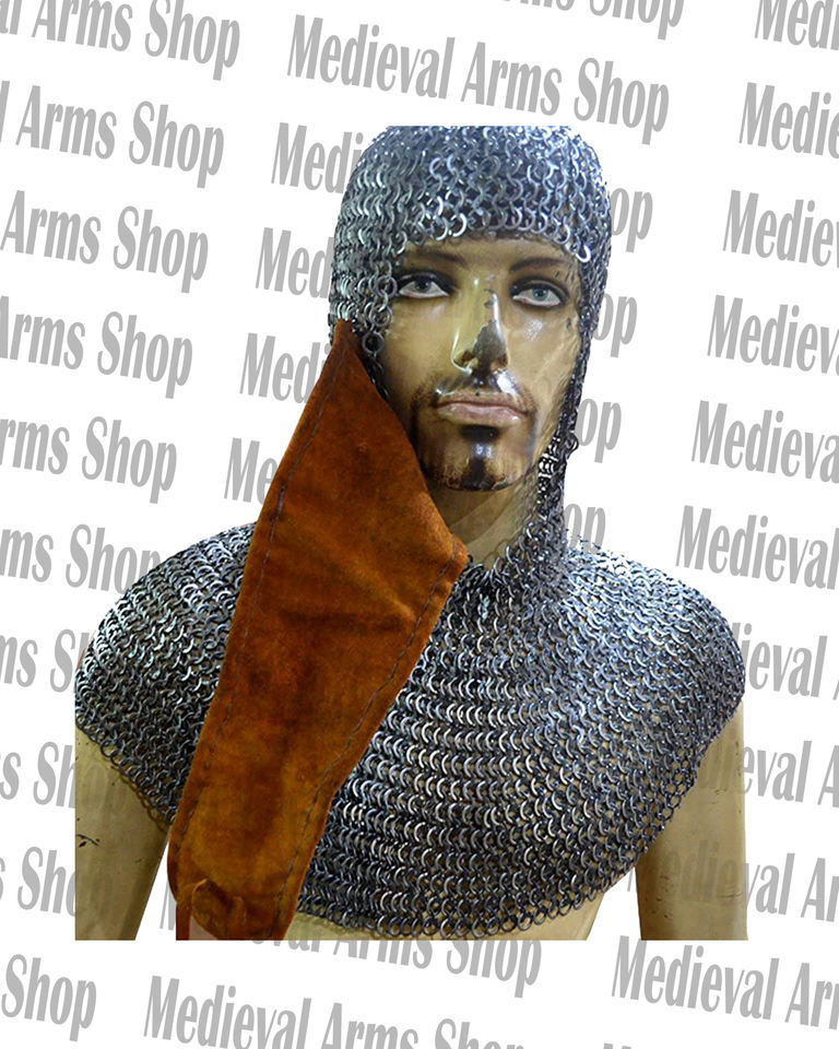 Cagoule médiévale artisanale en maille de fer avec rembourrage en cuir, armure de chevalier en acier doux à anneaux rivetés pour reconstitution historique et cosplay