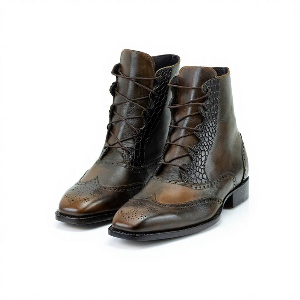 Bottes à lacets en cuir pour homme, faites à la main, style brogue, texture crocodile, bottes habillées formelles, style vintage