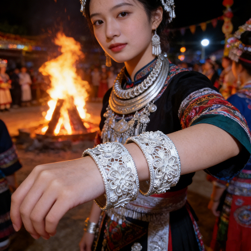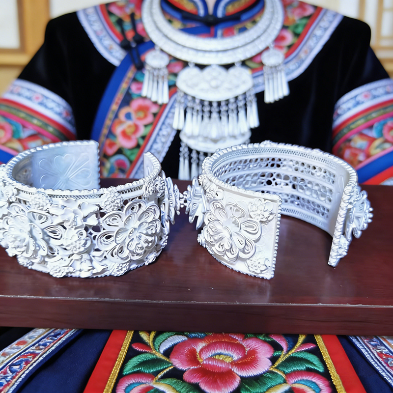 Bracelet manchette large en filigrane d'argent Miao fait main - Bracelet ethnique gravé à motifs floraux