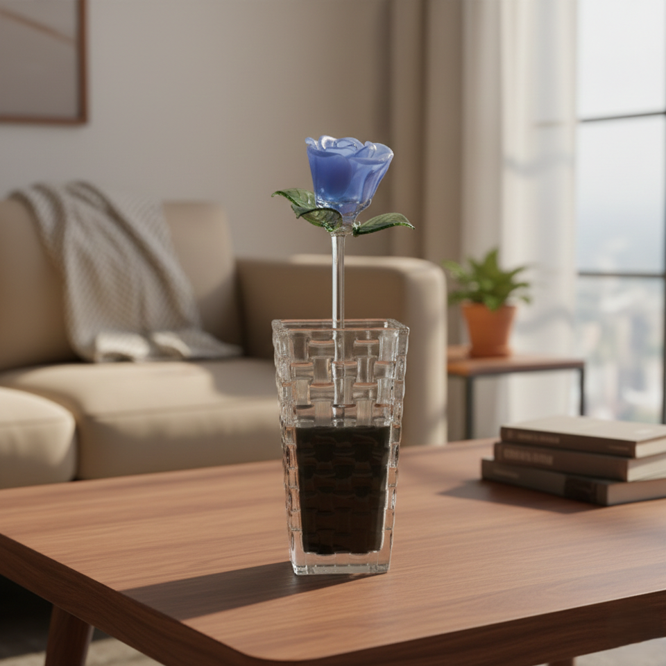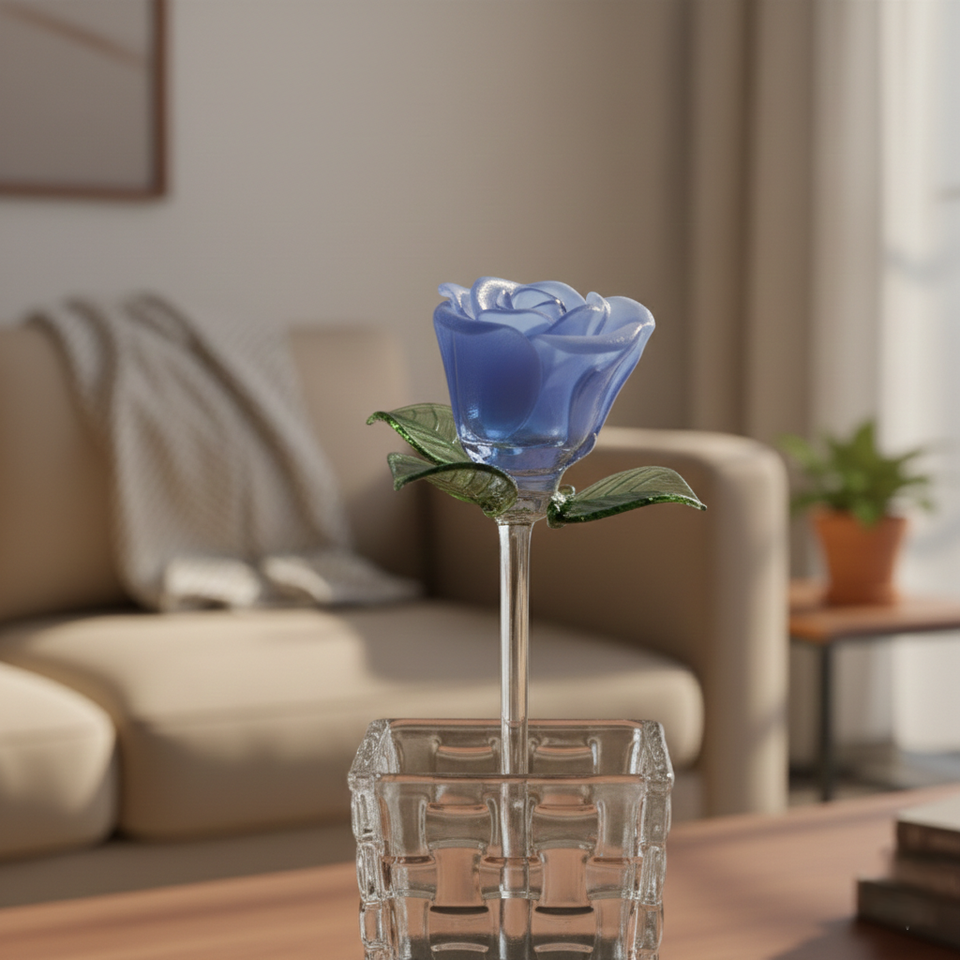 Vase de table en verre borosilicate bleu en forme de rose, design moderne fait main, avec emballage personnalisé pour cadeaux de la Saint-Valentin