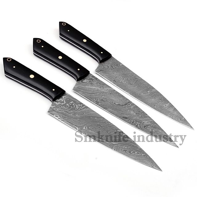 Ensemble de couteaux de chef en acier Damas de conception moderne faite à la main (SMK1562) 3 pièces G10 manche en bois cuisine professionnelle hacher la viande tranchante
