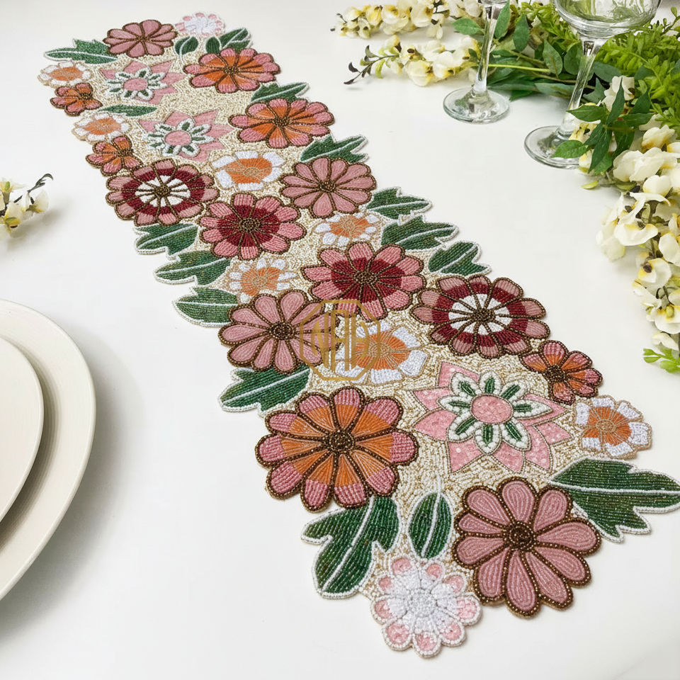 Handmade Modern Floral Table Runner and Placemat Custom Colors Beaded Embroidered Glass Beads Bulk Order