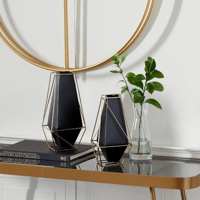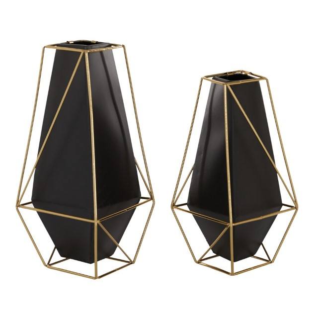 Ensemble de vases de table modernes faits à la main en fer avec cadre en fil doré géométrique, design contemporain en métal noir, style côtier