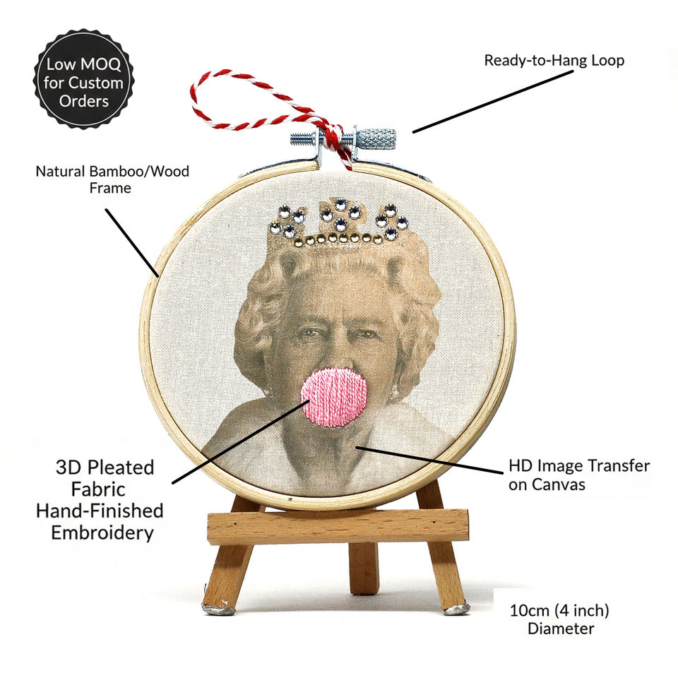 Broderie Pop Art Moderne Faite à la Main, Cerceau de 10 cm en Bambou et Coton Biologique, Motif 3D Bubblegum, Décoration Murale Reine Elizabeth II Paparesta