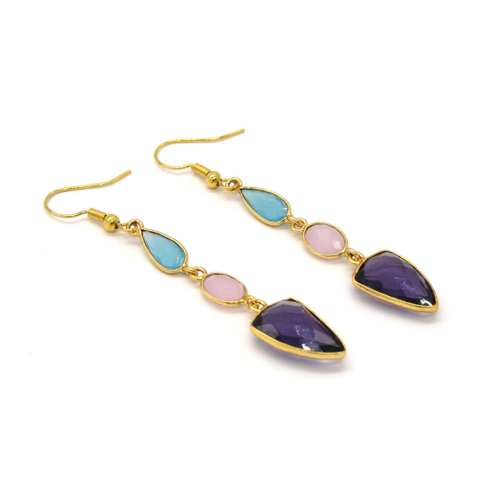 Boucles d'oreilles pendantes bohèmes faites à la main avec fleurs et pierres multiples | Calcedoine bleue rose, améthyste violette | Plaqué or 14 carats sans nickel