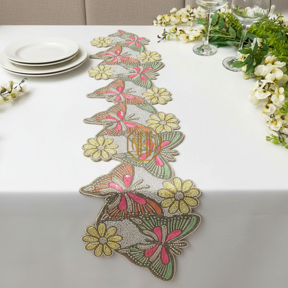 Ensemble de chemin de table et de sets de table brodés modernes, faits à la main, multicolores, à motifs floraux et perlés