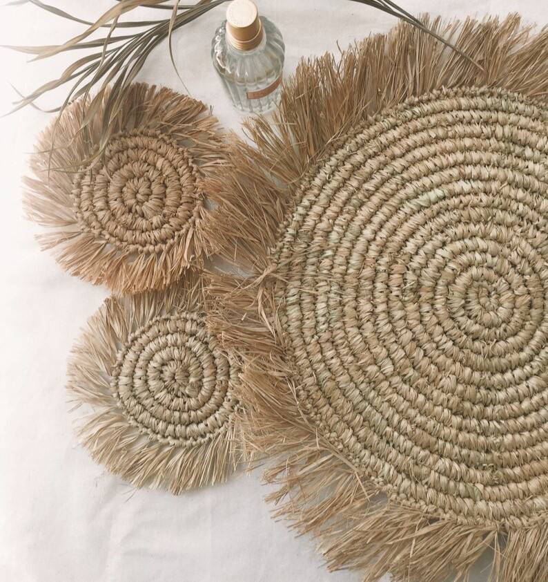 Dessous de verre ronds en cosse de maïs séchée naturelle faits à la main avec franges | Napperons en raphia Boho et sous-verres